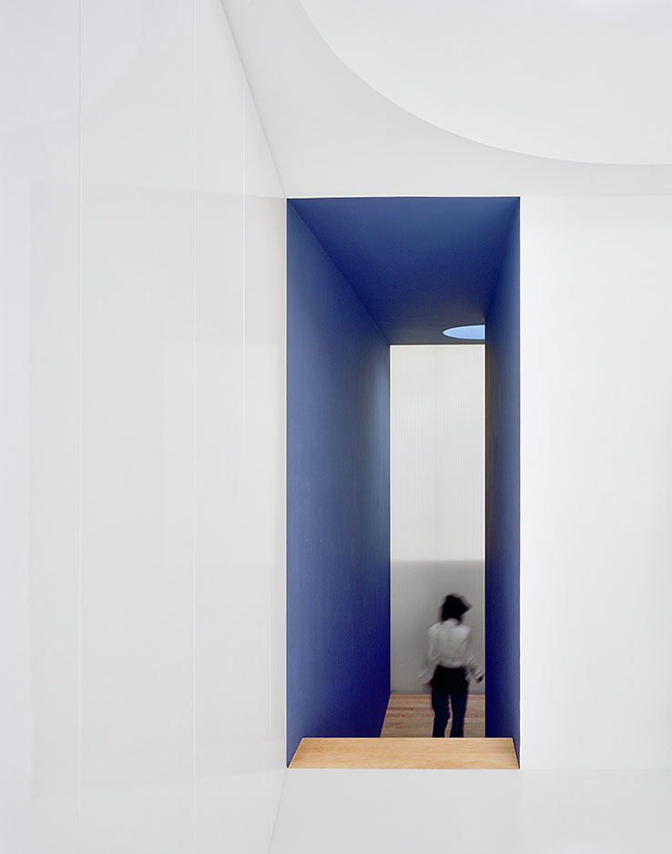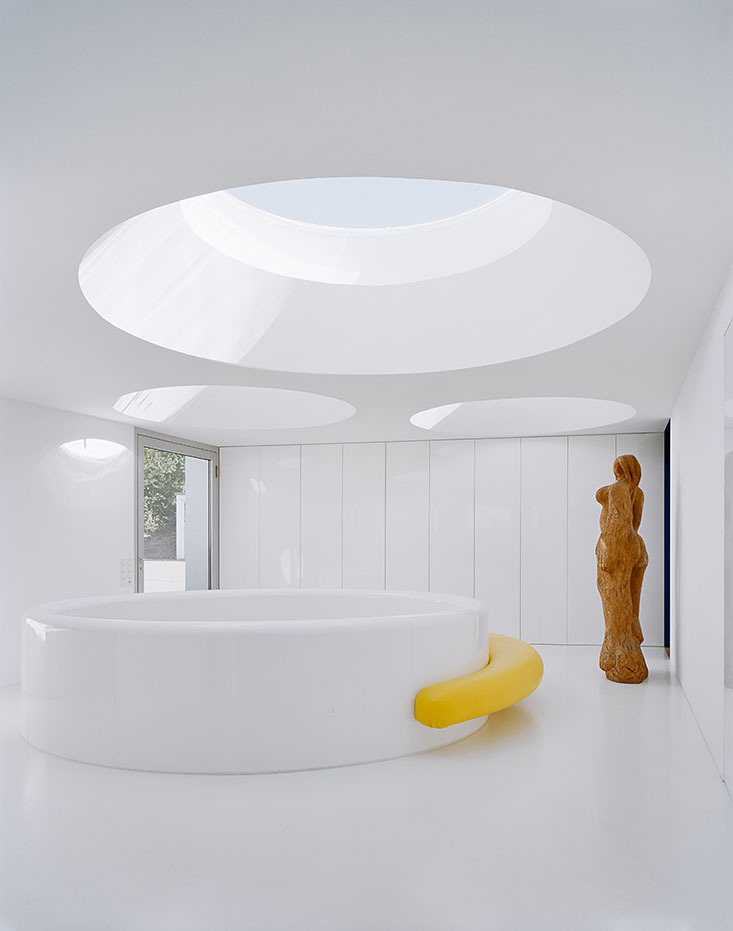 Aber um das Haus richtig zu verstehen, muss man hinein. Im Eingangsbereich die erste Überraschung. Große runde Oberlichte erhellen den Raum, und über eine noch größere runde Öffnung fällt das Licht auch in die darunterliegende Ebene. Beide Geschosse sind dadurch direkt miteinander verbunden. Eine gelbe Sitzbank schmiegt sich an die Brüstung. Schon jetzt ist klar: Hier wird nicht das Klischee das Architekten- oder Designerhauses reproduziert – ohne Farben, alles im rechten Winkel. Richtig, der Boden, die Wände sind weiß, ebenso die Türen der Garderobenschränke, die, ohne Griffe, sich auf Druck öffnen lassen. Aber von innen sind sie farbig. Nach links geht es durch ein in einem ins Violette gehenden, tiefen Blau gestrichenen Treppenhaus nach unten, daneben in die Schlafräume. Geradeaus kommt man in die Werkstatt, die aber auch über den anderen Hauseingang betreten werden kann. Spreng wollte Arbeiten und Wohnen im gleichen Haus haben, wollte dass beides seinen eigenen Bereich zugewiesen bekommt, aber nicht, dass das eine nichts mit dem anderen zu tun hat. C18 Architekten entwickelten eine Struktur, die dies leisten kann. Wie zwei U-förmige Bügel liegen die beiden Geschosse übereinander, das obere U ist zur Straße, das untere in die Landschaft geöffnet. Durch das Auge, das dabei entsteht, kann man nach unten schauen, auf einen Teich, auf dem auf einer kleinen Insel ein Baum gepflanzt ist, dessen Spitze man von der Straße aus sieht. Das untere U hat dabei kürzere Schenkel als das obere, so dass das Obergeschoss über das Untergeschoss auskragt, Teile des Freibereichs überdacht. Ganz nebenbei war die dafür notwendige Konstruktion, mit Auskragungen von bis zu sechs Metern, auch eine enorme statische Herausforderung. Links von diesen beiden sich überlagernden Bügeln schließt sich eine Zeile mit Zimmern und Bädern an. Am Ende liegt die Treppe, über die man in den Hochsitz, das Ausguckzimmer kommt, das man schon von außen gesehen hat.