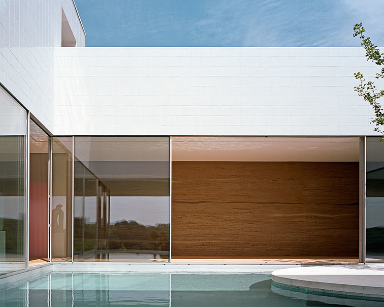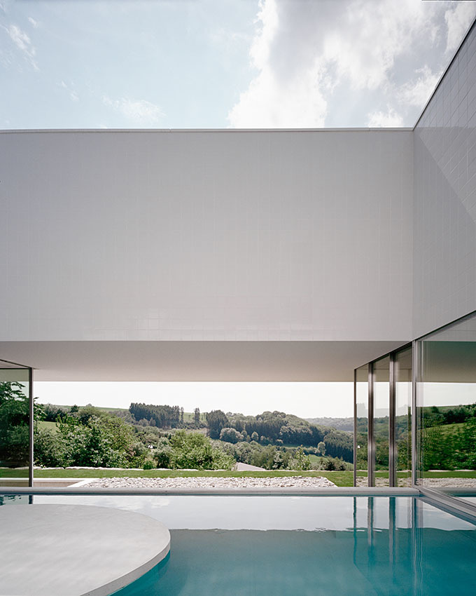 Von Schwäbisch Gmünd, im östlichen Vorland der Alb, führt die Straße wie auf einer Himmelsleiter bergauf, am Rechberg vorbei nach Wißgoldingen, wo sich die Landschaft nach Süden öffnet. Hier, an einem Südwesthang, haben C 18 Architekten für den Schmuckdesigner Georg Spreng und dessen Familie ein Haus mit Atelier gebaut. Zur Straße hin ist es verschlossen, fällt es vor allem durch seine Fassade aus weißen, quadratischen Fließen auf, auch die kubische Form unterscheidet es von den Nachbarn. Aber es ist nicht so, dass sich das Haus vor den Nachbarn verschließt. Ein Turmzimmer mit einem Fenster zur Straße, die zum Haus führt, verortet das Haus in der Nachbarschaft. Kein Zaun hält den Besucher ab, auf das Grundstück zu treten und über eine Mauer hinunter auf den Teich im offenen Atrium und in den Wohnbereich der Hausherrn zu blicken. Symmetrisch liegen hier zu zwei Seiten zwei Eingänge, mit zwei dicken roten Klingelknöpfen. Man kann hier schon einiges von diesem Haus mitbekommen, davon, wie sich das Innen mit dem Außen verschränkt, davon, dass man es hier mit einem besonderen Haus zu tun hat.