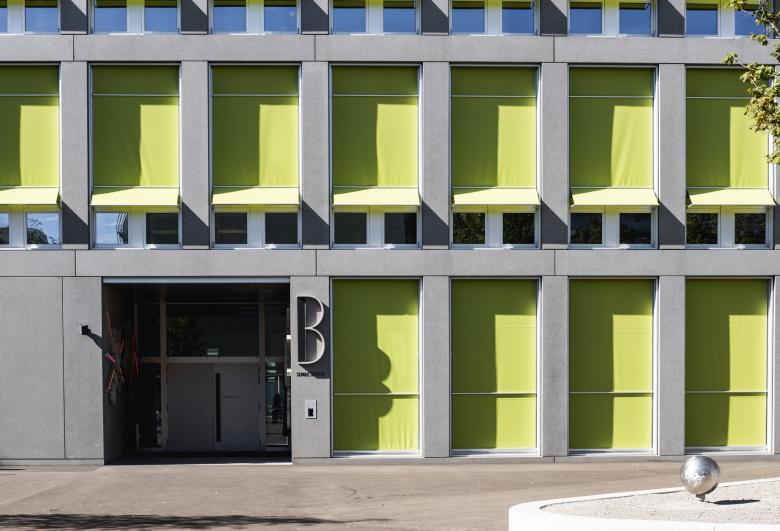Im Schütze Areal wird fleissig gelernt. Und es lernt sich leichter, wenn das Raumklima angenehm ist. Die Vertikalstoren in natürlichem Grünton tragen massgeblich dazu bei. In den oberen und unteren Geschossen hat Kästli Storen über vier Meter hohe Storen entwickelt, die dank mitlaufenden Windstabilisationsrohren und beschwerter Fallstange hohen Windgeschwindigkeiten standhalten. Auch die in den mittleren Geschossen montierten windstabilen Ausstellstoren mit Gasdruckelementen wurden in filigraner Machart in der Belper Manufaktur fabriziert.