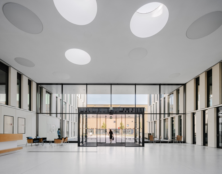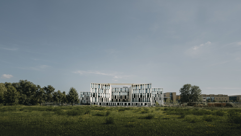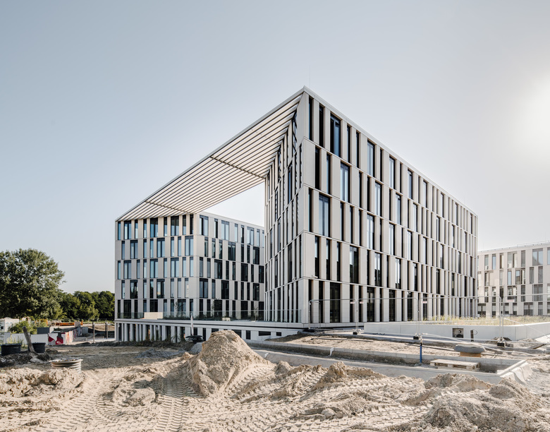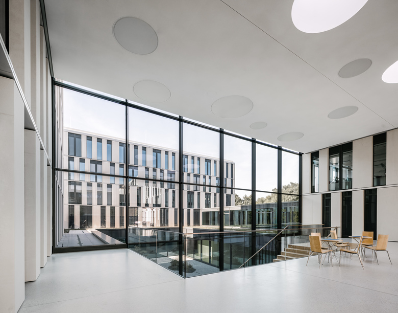 Der Entwurf für den Neubau der Investitionsbank des Landes Brandenburg ILB in Potsdam ist in drei Gebäudevolumen gegliedert, die über eine zweigeschossige Eingangshalle miteinander verbunden sind. Die drei Bauteile verfügen jeweils über einen Innenhof, der sich an einer Seite zur Landschaft hin öffnet. Das „Auengeschoss“ bildet als Sockelgeschoss die Basis für die drei Pavillons und beherbergt kommunikative Nutzungen wie Besprechungsräume, Mitarbeiter-Restaurant und Cafeteria.