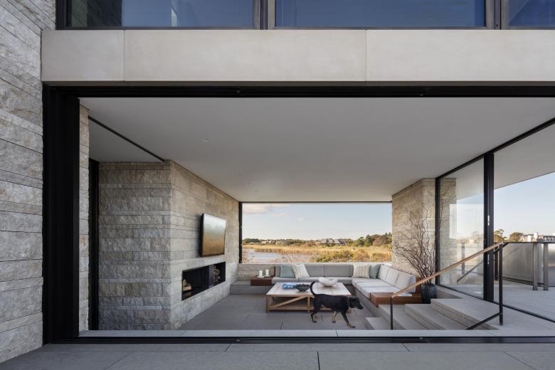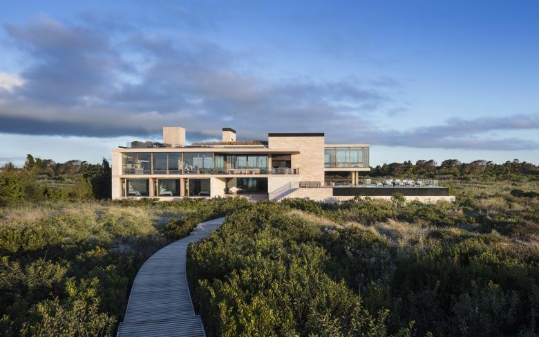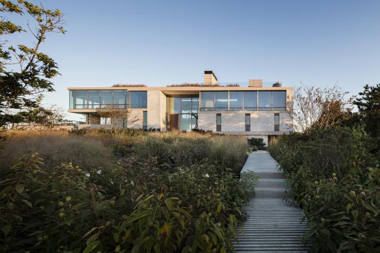Located in a dune field between the beach and a wetland preserve, this upside-down house emerges from the sand with a rough-hewn stone plinth base and glazed upper floors. To maximize views of the ocean and wetlands, the public living spaces are situated on the upper level while the private areas are nestled in the dunescape on the house’s lower level.