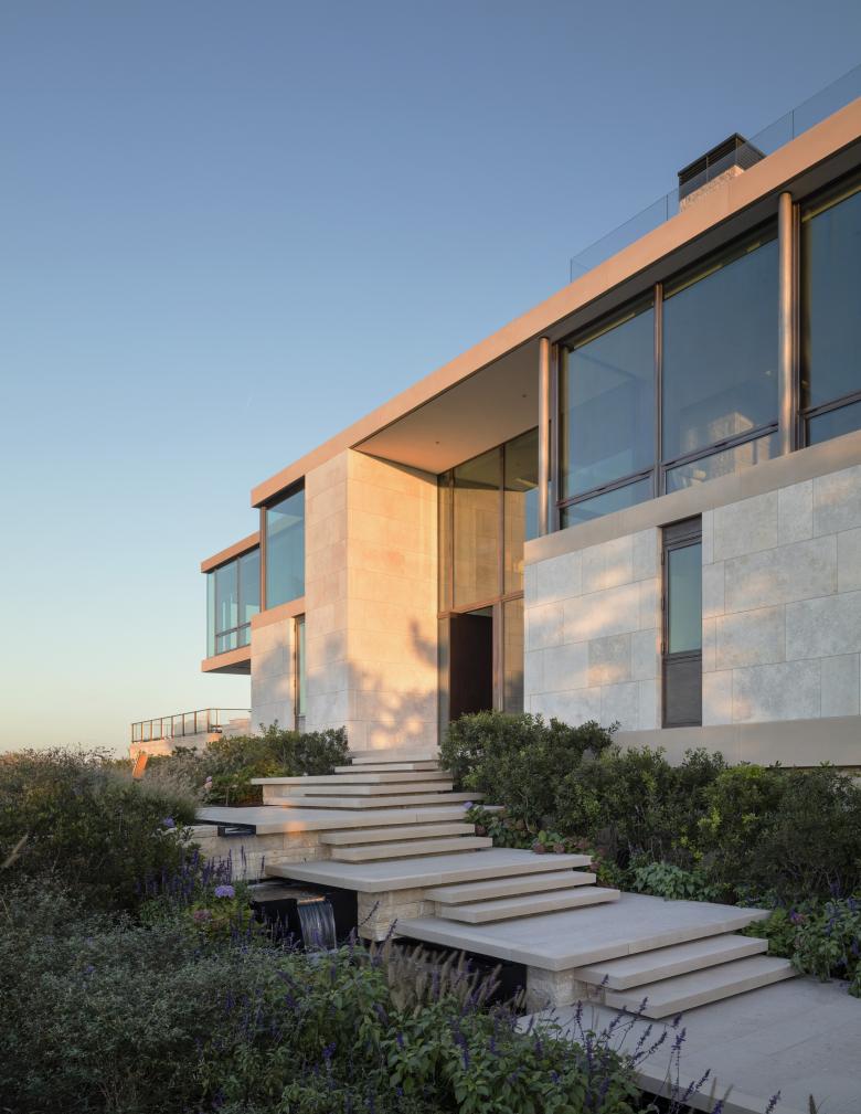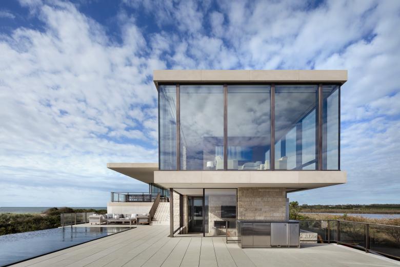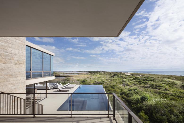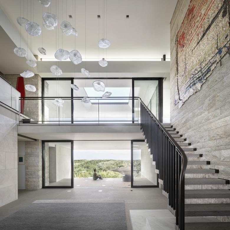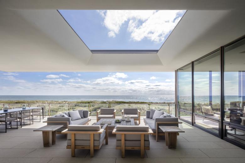 The entry foyer has been designed as a double height “cut” through the building, emphasizing the views of the surrounding dunes. The master suite cantilevers over the pool terrace with floor-to-ceiling windows capturing 180-degree headland, pond, and ocean vistas. The main floor features a cantilevered terrace roof with a “James Turrell” hole that invites the gazer’s eye skyward.