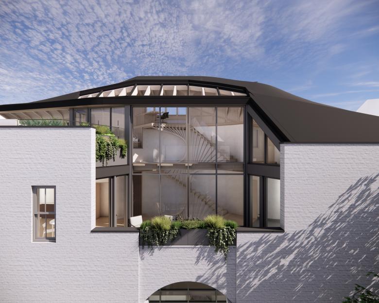 A triple-height garden rises from the first floor, bringing unexpected natural elements into the heart of the building. Terraces on the top two floors provide seamless transitions between indoor and outdoor living spaces, while planters and green roofs create a sense of living in a garden on every floor.