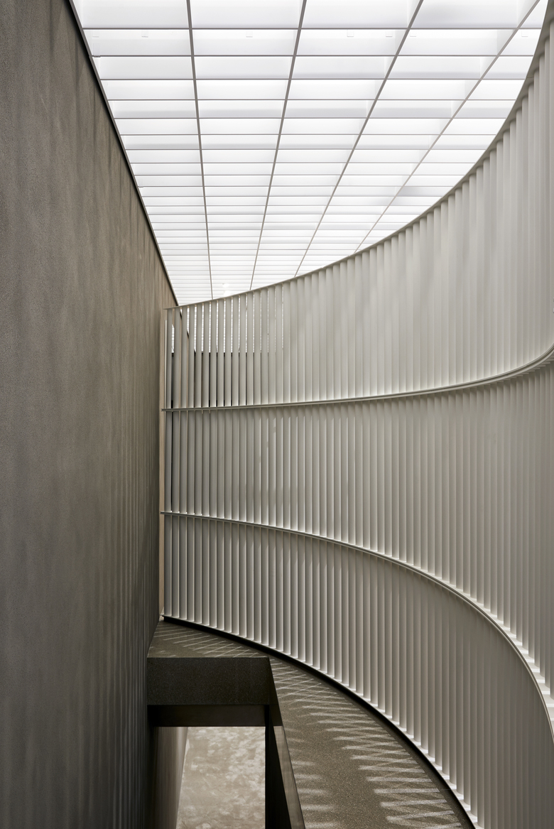 Durch ihr offenes Design erzeugen die halbrunden Metallschirme durch die gerichtete Beleuchtung von der Decke aus einen spielerischen Schatten- und Lichteffekt. Der Rhythmus der geräumigen Atmosphäre und das überraschende Element des Licht- und Schatteneffekts strukturieren das Kundenerlebnis.