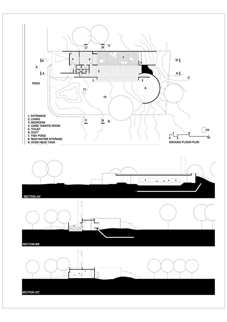 Scooped out of a plot of farmland twenty minutes outside Ahmedabad city, this house has been built for an aquarium shop owner to function as a place to breed fish as well as to serve as a weekend retreat. Its design is centred around four fish breeding tanks and an observation room which could double up as a living room. Every aspect of this design is set out to strip expense from the project; be it using 125mm thin concrete walls with standard concrete, one duct space for its three bathrooms, doors and windows made by pressing GI sheets or using bent rods to function as a handle and locking aldrop. On approaching the entry from the country lane one finds the entrance nondescript and hidden in the scrub. The mandatory margin required is used for the tank space – while the walls of the plot and house are used as a retention structure for the tanks. These tanks are enclosed by glass windows which runs the entire length of the living space, the added bonus being that the glass works out cheaper than a concrete wall, more so for aquarium manufacturers!