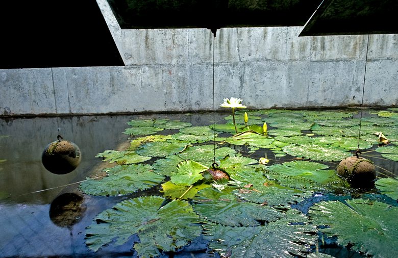 On entering the house one steps up into a corridor opening to a small powder room on the left, followed by a choice to either take the left into the bedroom, or to carry on down directly into the long living space. The layout of the house is such that several differing views of the water bodies are provided; in the bedroom space, the sitting ledge is just above the water level and looks down the long length of the pools; while the living space affords the inhabitant an uninterrupted view over the tanks when the windows are open, and view of the fish through below-the-sill glass windows. Resting half-sunken under the ground level, negating the need for foundations, the long concrete-box house splits the plot space into two distinct yet continuously mingling spaces; it opens on one side to the garden and to the four nine thousand litre fish breeding tanks on the other. The living area can be opened to either of these two spaces by top hung metal shutters which extend at eye level through the entire length of the walls. When closed it is a 13m long and 3.6m wide space rendered by the light through the fish tanks. On opening the shutters this linear space transforms completely into an infinite one perpendicular to its original direction. The metal shutters are held by handmade concrete baubles, the cheapest counterweights possible; they either swing in the wind when windows are partially open or dip out of view into the lily padded pools when the windows are fully open making the house animated in use or even without.