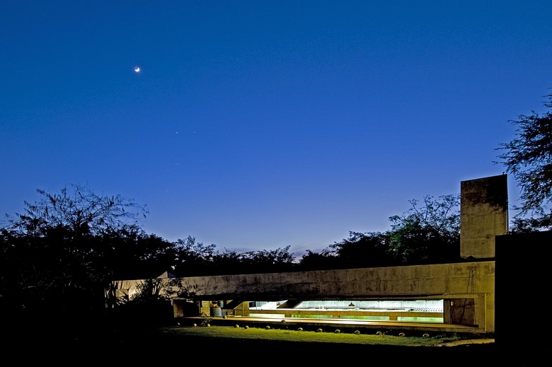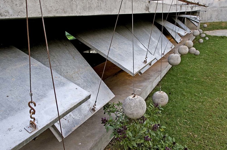 The concrete frame around the window plays multiple roles; as a seat from the garden side, steps for children to climb on from the garden or jump to from the terrace, a weather protection device while also providing a rat & snake proof section. It starts serving as a bar counter with the attached kitchen platform for larger gatherings. The grassy knoll that rises in front of the long opening bears under it a bio-gas plant, fifty thousand litres of rain water storage, and an earth heat exchange tube. Back through the shrubbery and fields the house assumes a squat position; the curving wall to one side allows one to walk up a gentle slope on to the terrace running over the length of the house. The weekenders enjoy the feeling of floating over a bed of lily petals while being weighed down by the baubles.