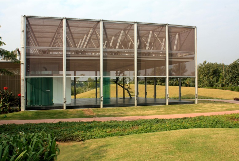 Though less prevalent today, in our childhood we slept outdoors under a simple net held up by intersecting poles which, once we tucked in, became our private domain, a safe haven. When the brief for a weekend house in the fringes of the city asked for a place that is open to nature yet shields you from its harsher aspects, memories of the net and the protection it offered came to mind. A virtual jungle of hoardings, telecom towers and temporary structures now make up the Indian city skyline. This same image reverberates in the light composite steel and concrete hand fabricated trellis that holds up the hovering slab and leaves the floor below free.