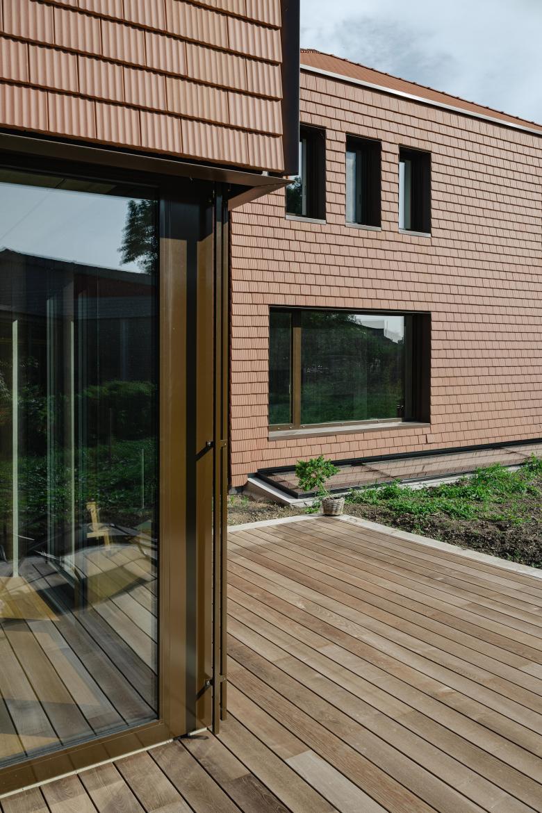 Das Einfamilienhaus-Ensemble in Diessenhofen besteht aus zwei quadratischen Gebäuden, die unmittelbar neben der Altstadt Diessenhofen stehen. Die Häuser sind jeweils mit einem Zeltdach ausgestattet, das für eine harmonische Optik sorgt. Die besondere Eigenschaft der Gebäudehülle ist die Verwendung von Biberschwanz-Ziegeln sowohl auf dem Dach als auch an den Fassaden. Dieses Gestaltungselement wurde bewusst gewählt, um eine harmonische Verbindung zwischen den Neubauten und der Altstadt zu schaffen.