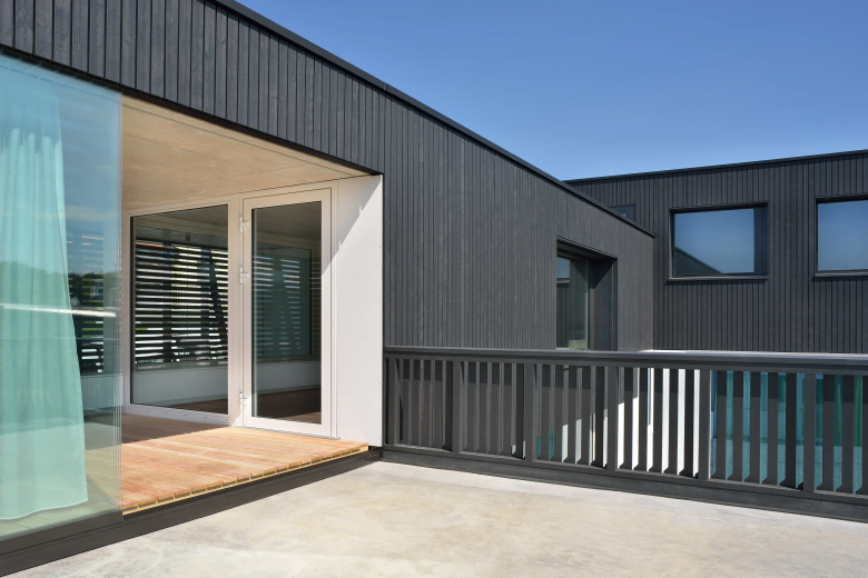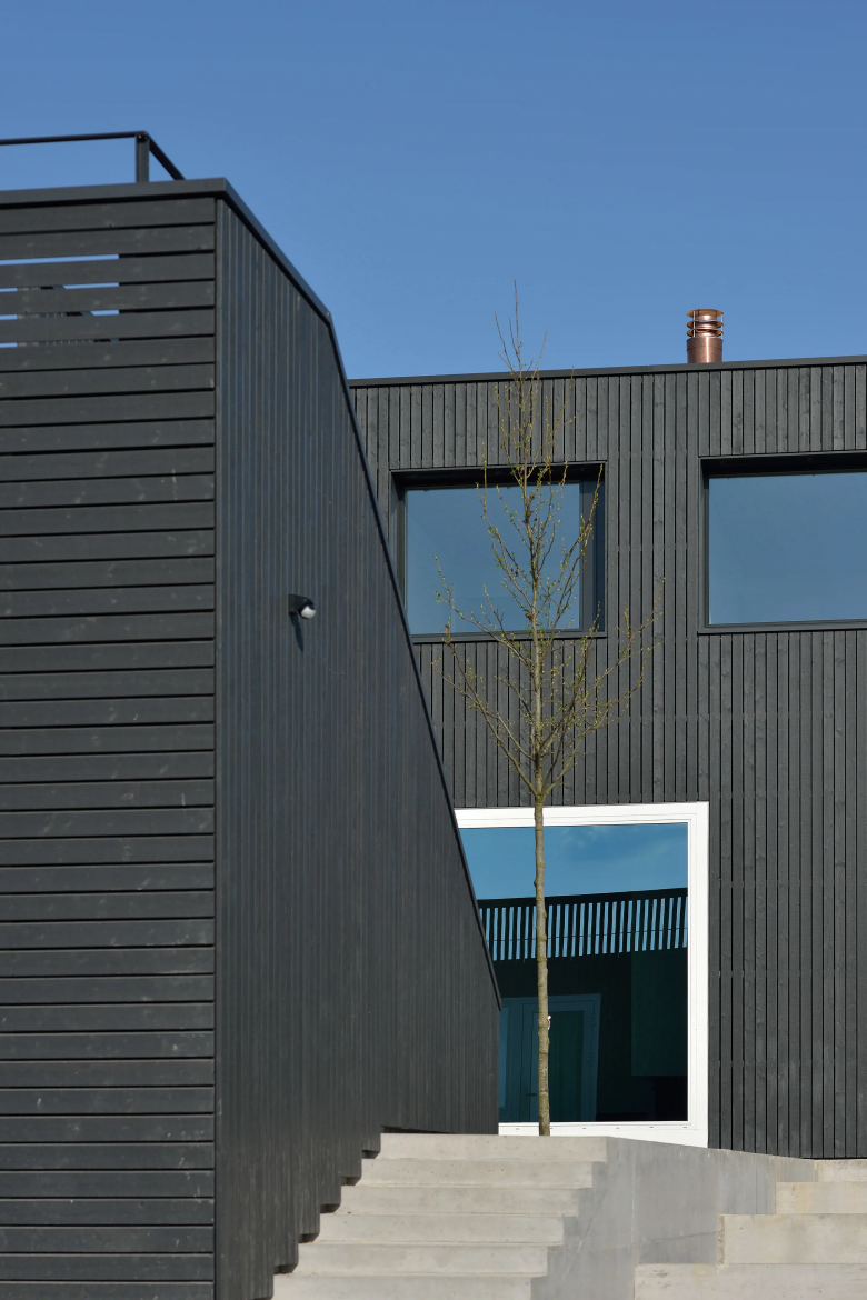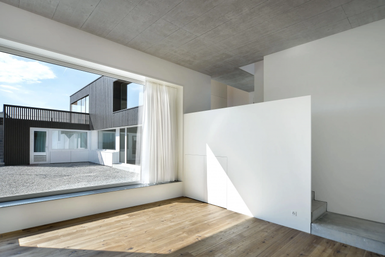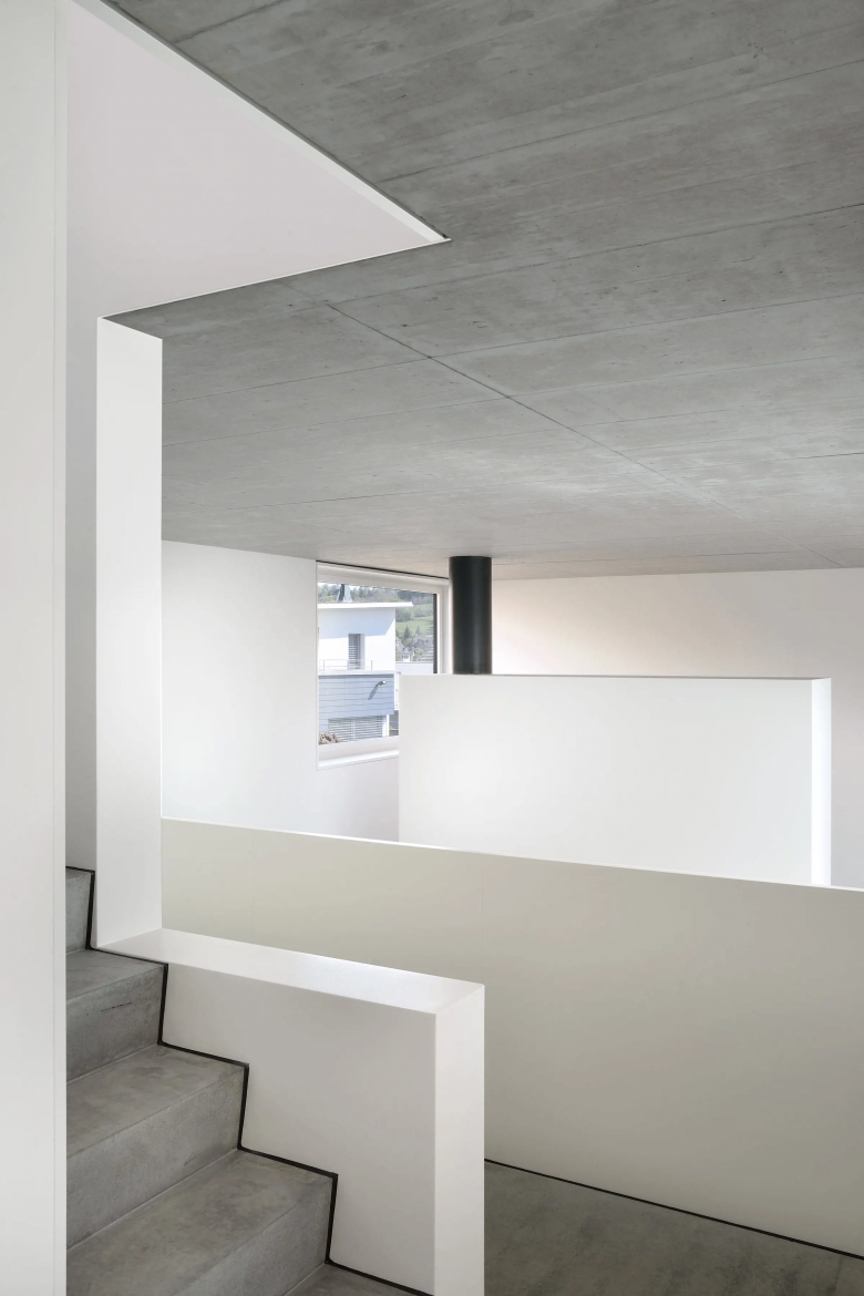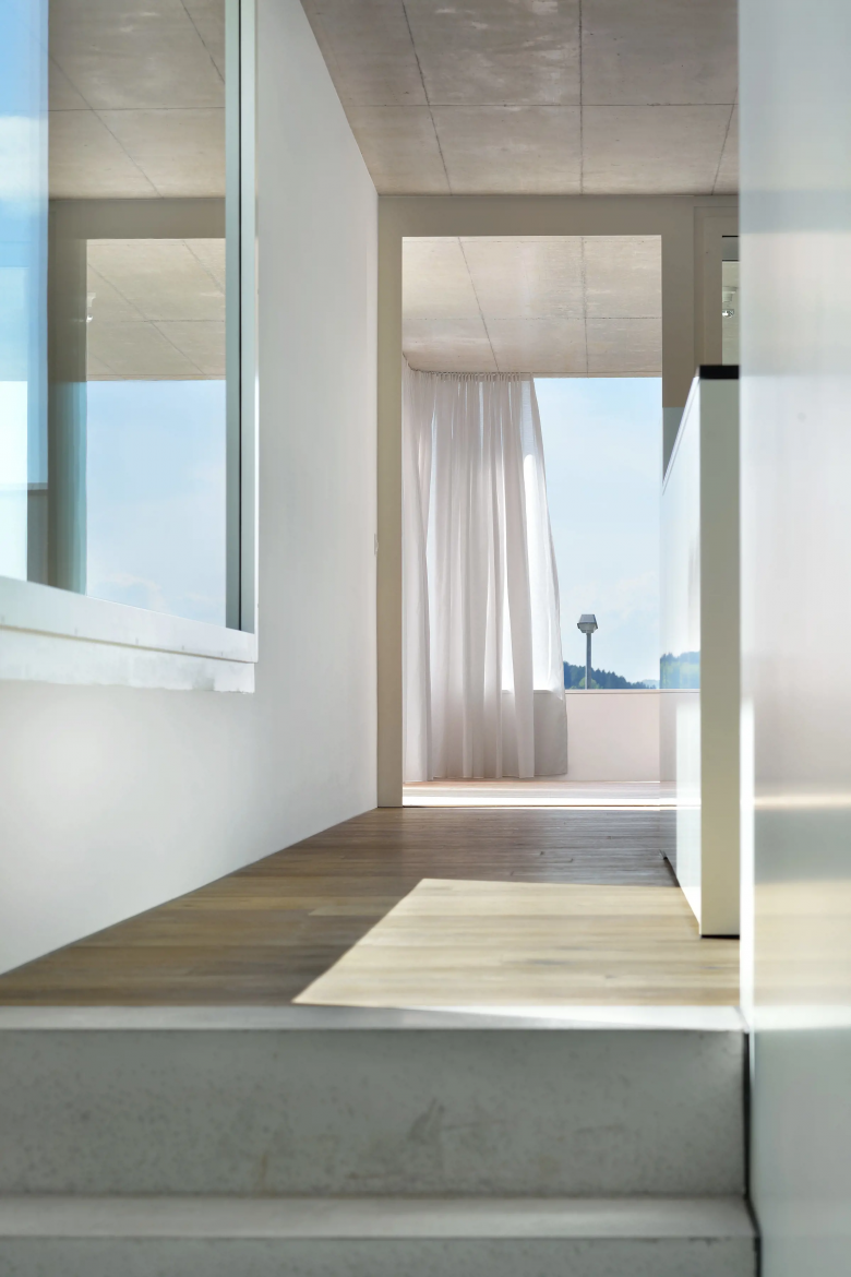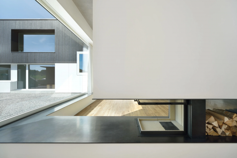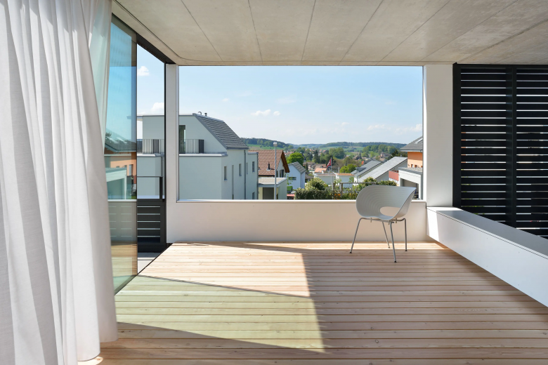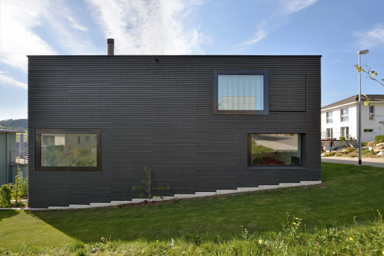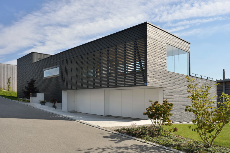 Am westlichen Rand von Gachnang an einen ehemaligen Rebhang gebettet liegt das Einfamilienhaus und entwickelt sich um seinen eigenen Innenhof. Mit seiner horizontalen und vertikalen Holzverschalung fügt es sich unauffällig in seine Umgebung ein. Das überhohe Wohnzimmer betritt man auf halber Höhe und steigt über eine kleine Treppe hinab. Die Öffnungen wurden entsprechend ihren spezifischen Ausblicken gesetzt und bieten Querblicke in andere Räumlichkeiten sowie unterschiedliche Lichtqualitäten.