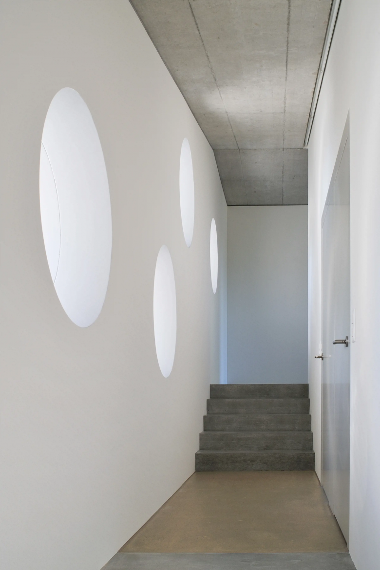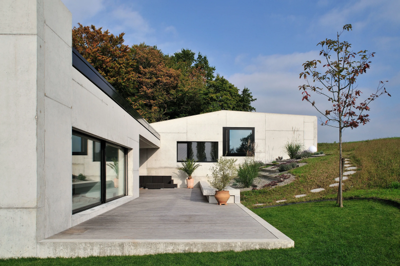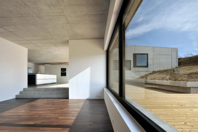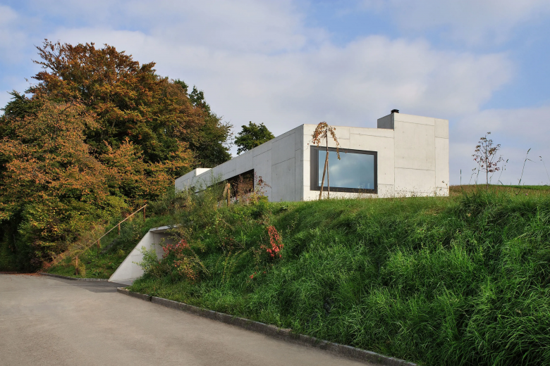 Über dem Dorf von Islikon schmiegt sich das Gebäude dem Terrain entlang. Eingepflanzt in die Natur – kein Weg führt zum Haus. Der Zugang erfolgt über einen Einstich in den Hang. Der Grundriss orientiert sich nach der Sonne und gibt immer wieder inszenierte Ausblicke frei. Die grossflächige Schalungsstruktur der Sichtbetonfassaden verstärkt die skulpturelle Erscheinung des Hauses.