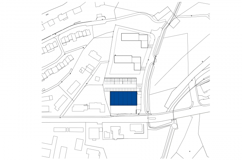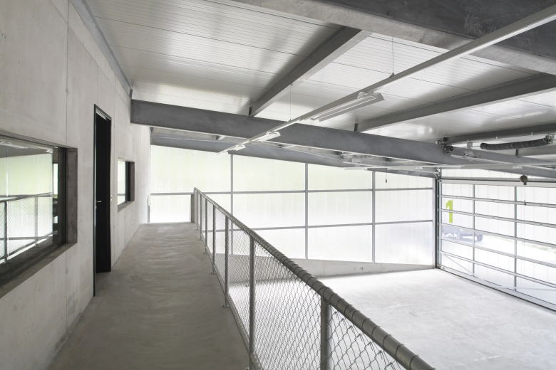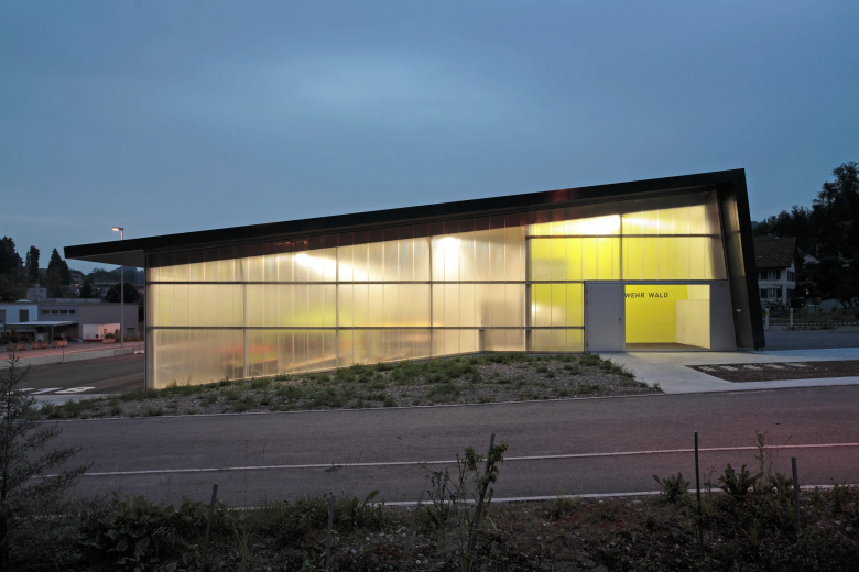 Die Orientierung des Feuerwehrdepots unterstreicht einerseits die Wichtigkeit dieser Einrichtung. Andererseits bewerkstelligt sie den Lärmschutz der dahinterliegenden Wohnbebauung gegenüber der Strasse und der ausrückenden Feuerwehr. Schnelle Erreichbarkeit und Blickkontakte zwischen verschiedenen Räumen innerhalb der Einrichtung sind wesentliche Entwurfsanforderungen. Die Fassaden aus transluzenten Stegplatten bieten tagsüber gute Belichtung und lassen nachts die seitlichen Fassaden und Tore im Einsatzfall zur Strasse hin wie Laternen leuchten – ein Alarm der subtilen Art.