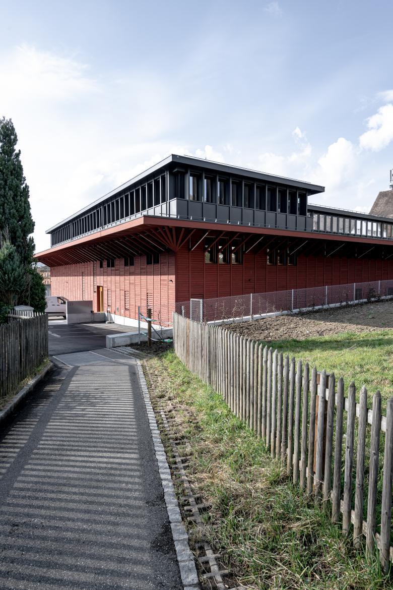Das Gebäude fügt sich dank seiner Architektursprache gut in den Ortskern ein und schafft einen sanften Übergang zur Landschaft. Die Farbgebung wurde aufgrund einer Analyse der umliegenden Gebäude ausgewählt.