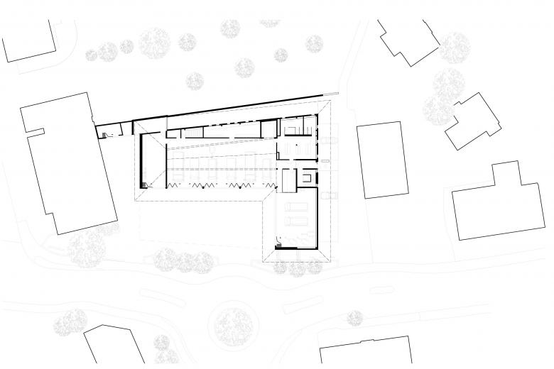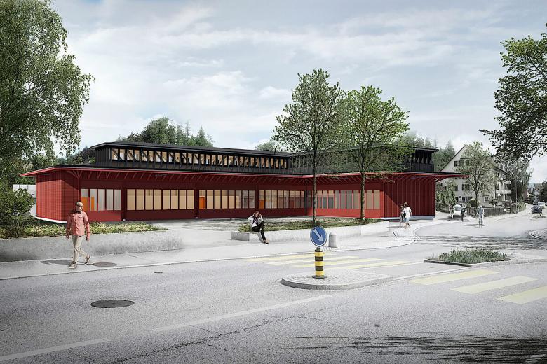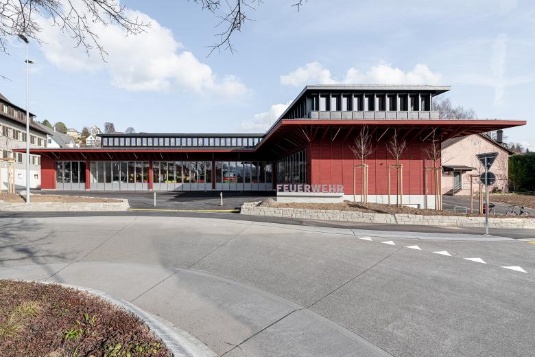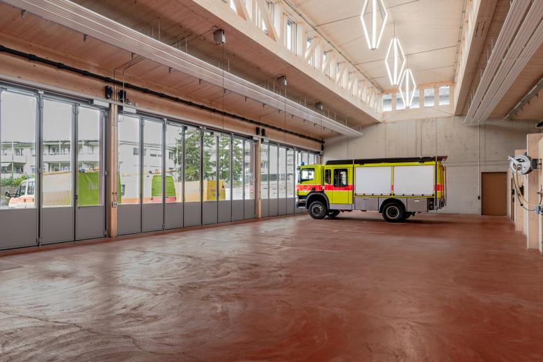 Das Feuerwehrdepot wurde winkelförmig gestaltet, um sich gut in die örtliche Situation einzufügen und optimale Funktionsabläufe auf einem begrenzten Baugrund sicherzustellen. Die Aufteilung der Fahrzeughalle ermöglicht eine effiziente Nutzung des Vorplatzes. Der Gebäudeschenkel zur Strasse hin entflechtet die einrückenden Feuerwehrpersonen von den wegfahrenden Einsatzfahrzeugen und minimiert die Einrückungswege.