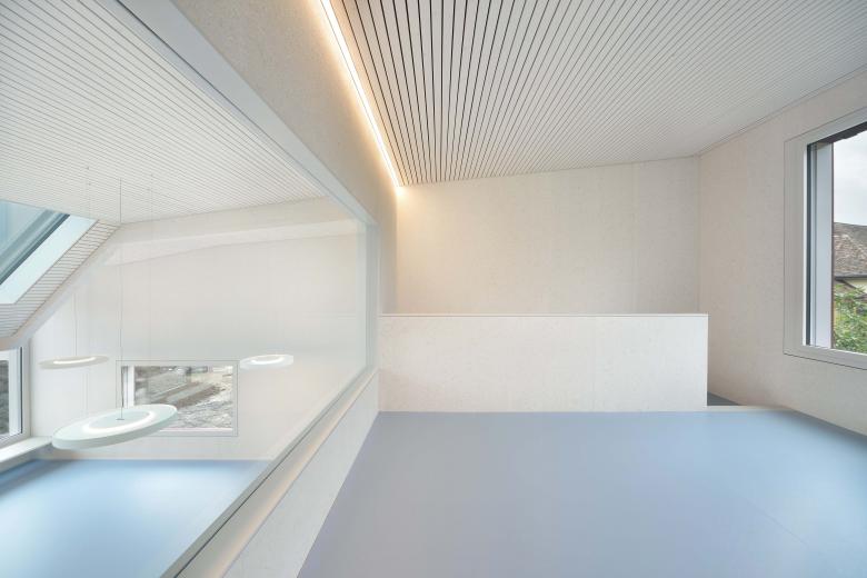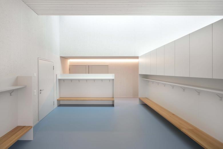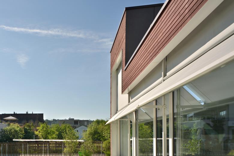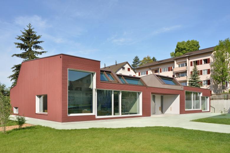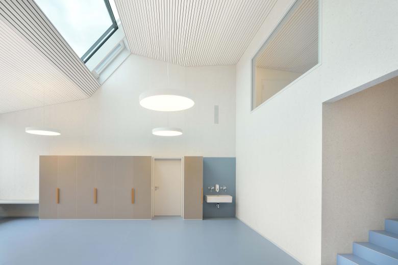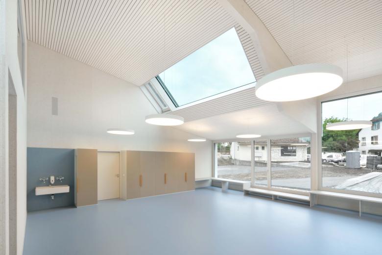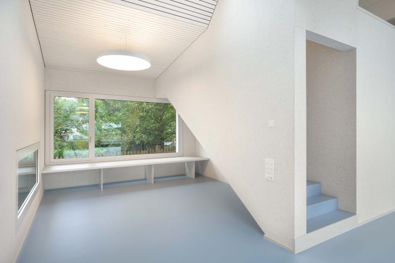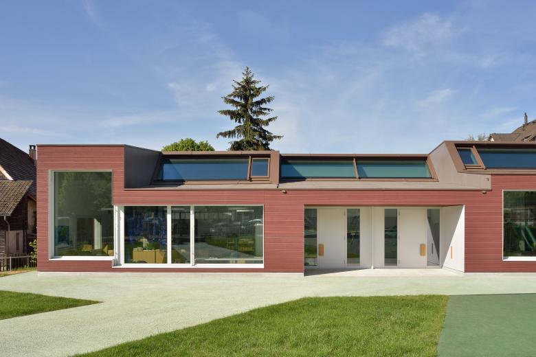Der neue Kindergarten fügt sich harmonisch in den Dorfcharakter auf der Chilbiwiese ein und berücksichtigt dabei die öffentlich und privat definierten Freiräume. Der dazwischen liegende Raum dient als Aussenspielbereich und bietet somit ausreichend Platz zum Spielen und Toben. Durch den Verlauf der Decke werden unterschiedlich grosse Räume erlebbar. Die grosszügigen Fenster schaffen eine Verbindung zwischen Innen und Aussen und sorgen für eine hohe Übersichtlichkeit. Bei der Wahl der Materialien wurde auf Naturmaterialien wie Holz und Linoleum gesetzt, was nicht nur eine angenehme Haptik bietet, sondern auch für eine lange Haltbarkeit und geringere Folgekosten sorgt.