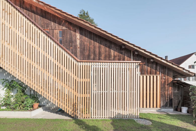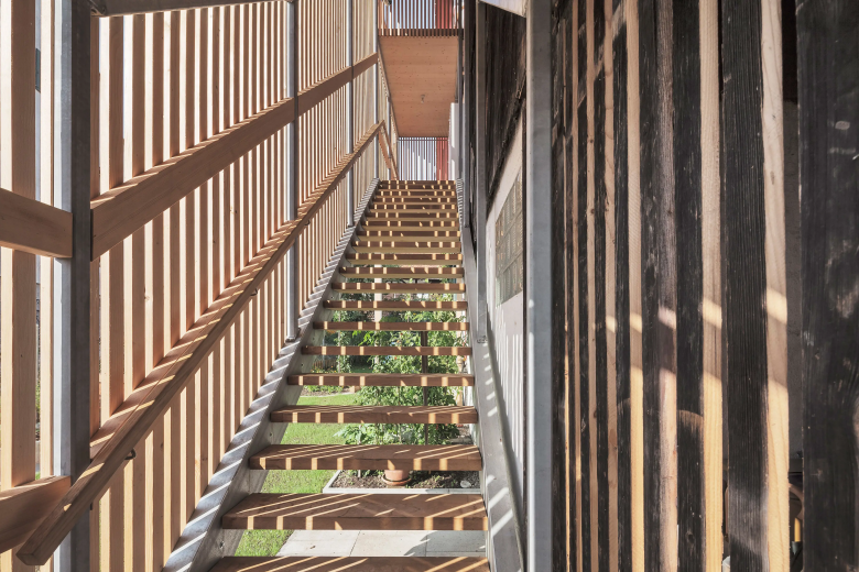 Im Zuge der Umnutzung des Büros zu einer Kleinwohnung wird die Erschliessung des Dachgeschosses auf die Ostseite verlegt, damit die Zugänge der zwei Parteien komplett getrennt sind. Die Treppe ist so ausgestaltet, dass auf dem darüberliegenden Dach ein Aussenraum für die Wohnung entsteht. Die leichte Stahlkonstruktion mit einer luftigen und zurückhaltenden Holzverkleidung konkurrenziert die schöne Riegelfassade und haltet die Eingriffe im Bestand gering.