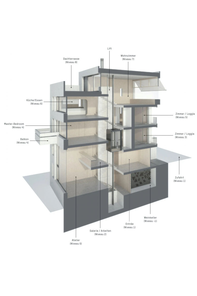 Townhouse One ist ein Einfamilienhaus mit Sichtbeton-Fassade und einer beeindruckenden Aussicht über den Zürichsee. Die halbgeschossig versetzten Geschosse in Splitleveln ergeben eine Raumskulptur, die immer neue Sichtbezüge, Durchblicke und unterschiedliche Raumhöhen ermöglicht. Je nach Raumnutzung entstehen so ein-, eineinhalb- oder auch zweigeschossige Räume mit wechselnder Orientierung. Die präzise gesetzten Fenster und Öffnungen unterstreichen das Konzept. Die Erdsondenheizung mit sommerlicher Kühlfunktion erzeugt auf ökologische Weise Wärme. Das Gebäude ist Minergie-zertifiziert.