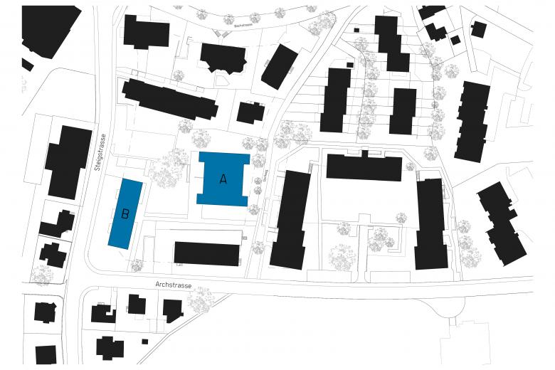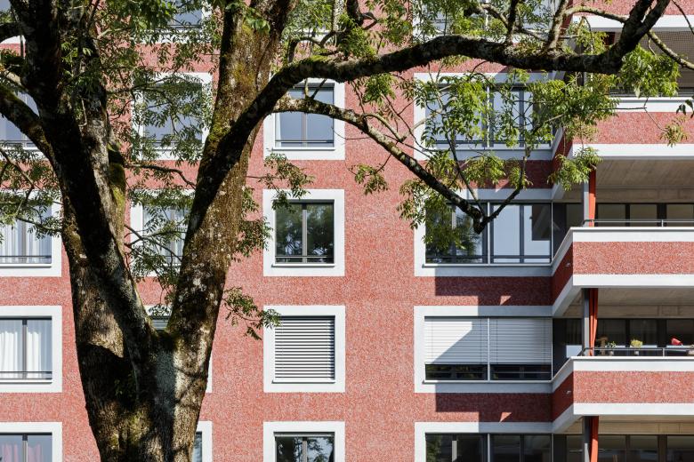 Das Punkthaus und das längliche Haus fassen den Strassenverlauf und schaffen einen zentralen Platz um die mächtige Esche, der den Mittelpunkt der Siedlung bildet. Gemauert und verputzt, ohne zusätzliche Aussenwärmedämmung, orientieren sich die Neubauten an den historischen Gebäuden von Uster. Grober, eingefärbter Kellenwurfputz, dessen Putzspitzen mit einer zweiten Farbe überrollt wurden, nimmt alte Handwerkstradition auf. Die glattverputzten hellblauen Laibungen knüpfen an die Rahmung der Kreuzstöcke alter Häuser an.