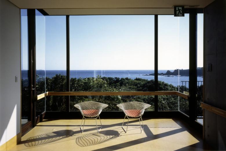 The expanded Z-shaped building has being laid by the axis from the mountains north to the sea south. Along to this Z-shaped architecture, the vast land has being divided into a pair of L-shaped fields; one is the approach to the entrance facing the mountains and the other is the garden covered with lawn facing the ocean. At once transparent space has being created in the middle section of the Z-shaped building, to produce a sense of free spatial flow from the mountain to the ocean throughout glazed windows.