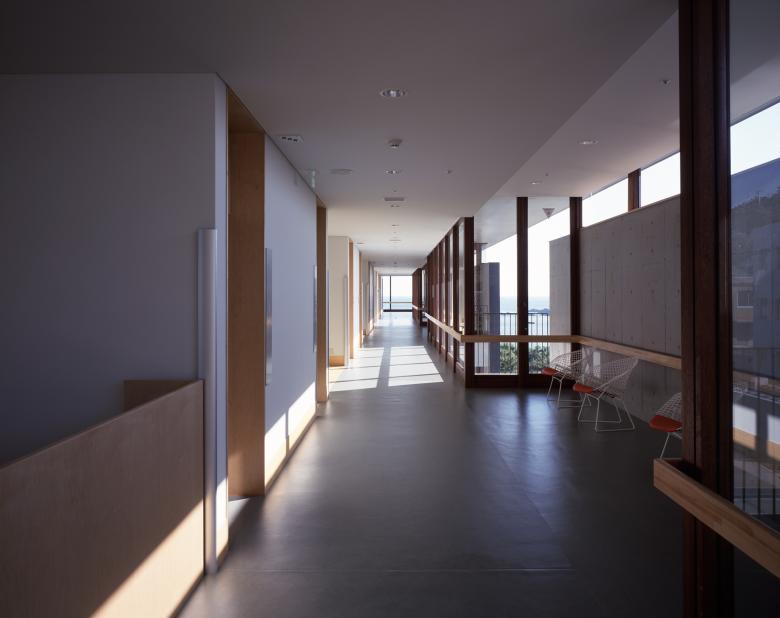 With the placement along the axis of this site extending north and south in length but is narrow east and west, the building was adopted the type of side corridor access. The corridor extending north and south is more than a mere passage in functional meaning, takes on variety planer shape and size, becomes unified with smallish day rooms or galleries in each space, and has continuity with dining halls, large day rooms and exercising room. Furthermore through windows of varied shape and size, the corridor forms bond between inner space of life with scenery of natural environment and of children’s lives in junior high school and elementally school next to this site. At the southernmost of the corridor of building, there was to be the spaces where aged peoples might have easygoing flow of time enjoying the magnificent view of the Pacific Ocean. Every individual bed-sitting room is oriented so that aged people can wake up in morning sunlight. And were aged people is able to go off by oneself, and abele to be sunk in thought peacefully viewing the scenery of the sea by day, enjoying the starry sky at night.