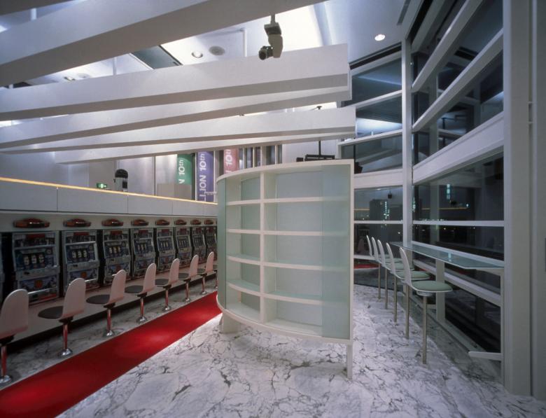 From the plaza, one can perceive the calm, subdued atmosphere created by the interior's white color scheme and indirect lighting through the glass screen. Together with its exterior, this design breaks away from the conventional image of pachinko parlors characterized by excessive colors and signage, proposing a refreshing pachinko parlor that is accepted by the local community.