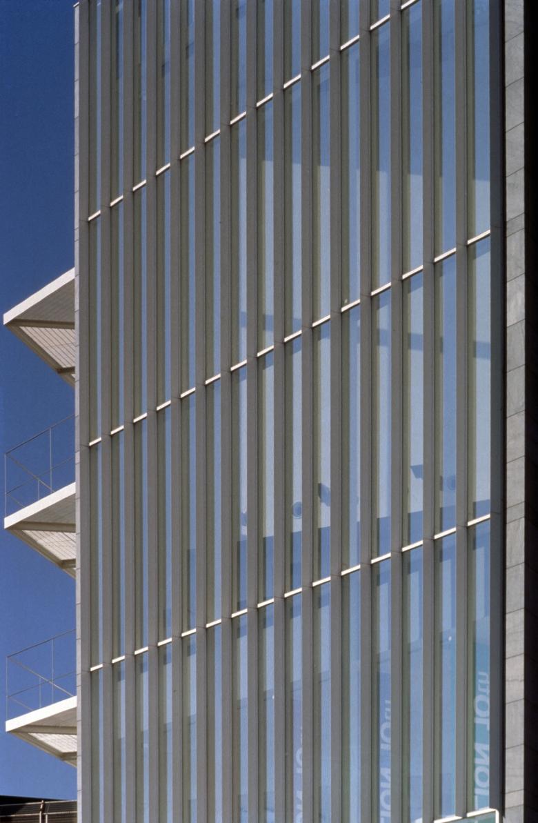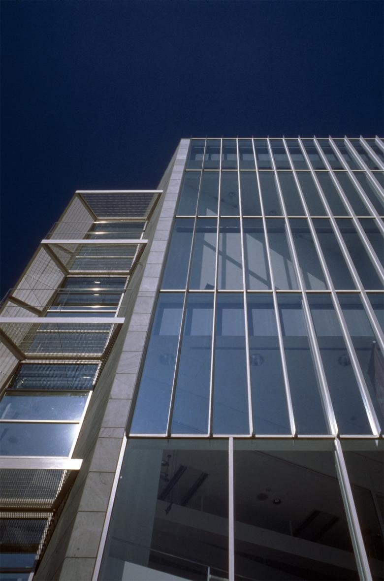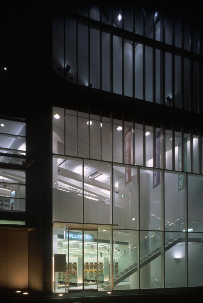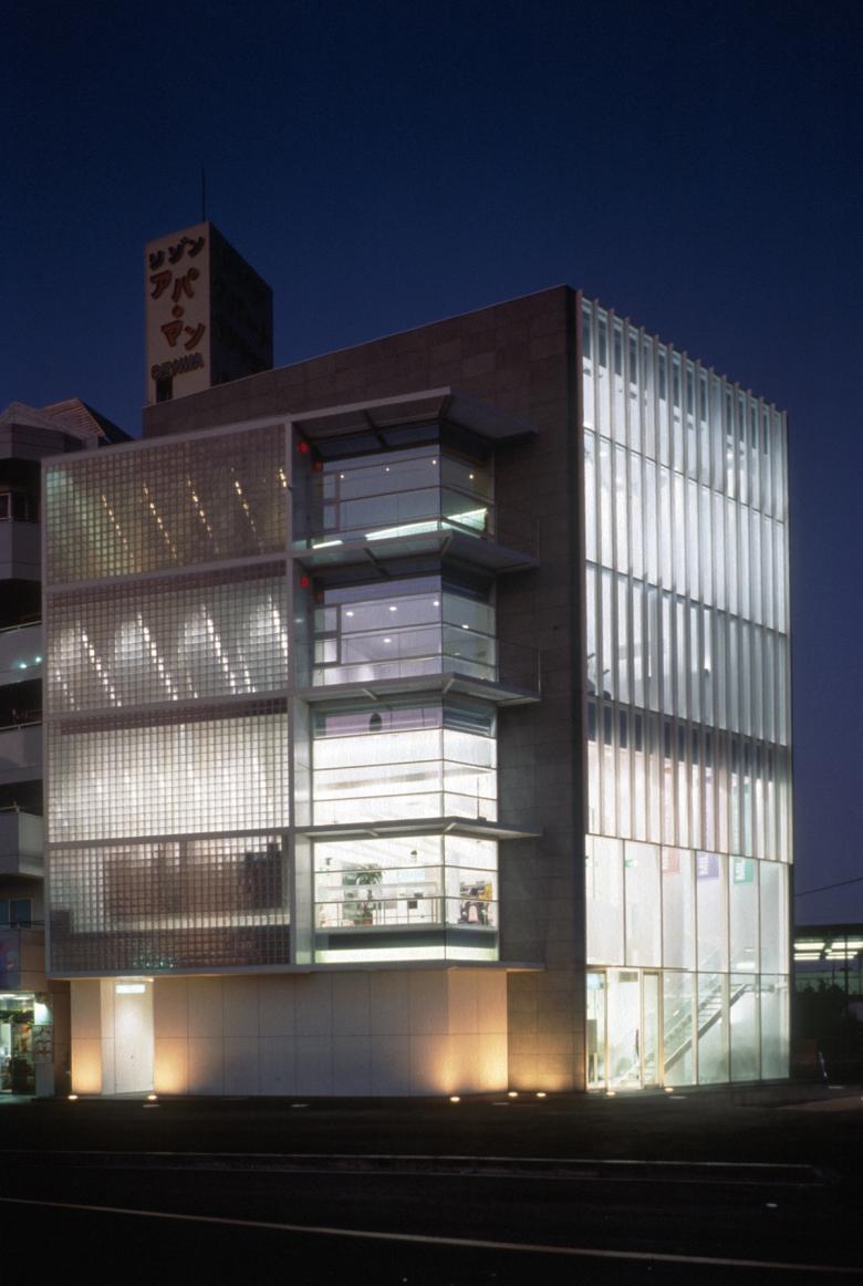 The plaza-facing facade was designed as a vertical glass screen to serve as a landmark for the station area. This section features a 13-meter-high atrium extending from the basement level, with stairs connecting three floors further emphasizing verticality. The city road-facing facade emphasizes horizontality through openings and balconies that create a sense of lateral expansion. The southwest corner features glass blocks, creating a bright, enclosed space within.