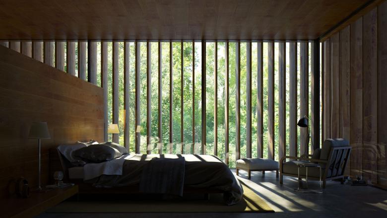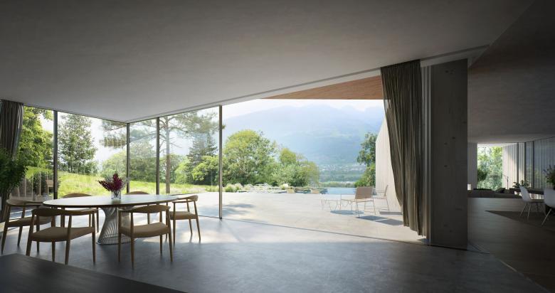Beinahe klassische Raumfolgen und Proportionen wirken monumental und zeitlos – erschaffen mit dem Land und ausdem Land, in Marmor und Holz. Das Schweizer Landschaftsarchitekturbüro Enea gestaltete eine Erweiterung des Waldes, um die Landschaft ins Haus hineinzuführen. Rund um und im Inneren des Gebäudes verbindet diese bereicherte Naturlandschaft Räume und Grenzen und schafft so eine intime Beziehung zur Natur.