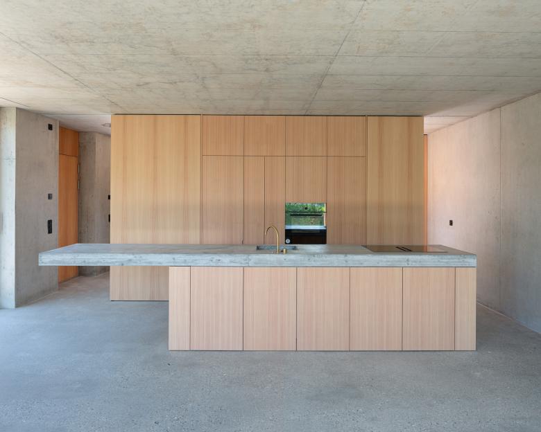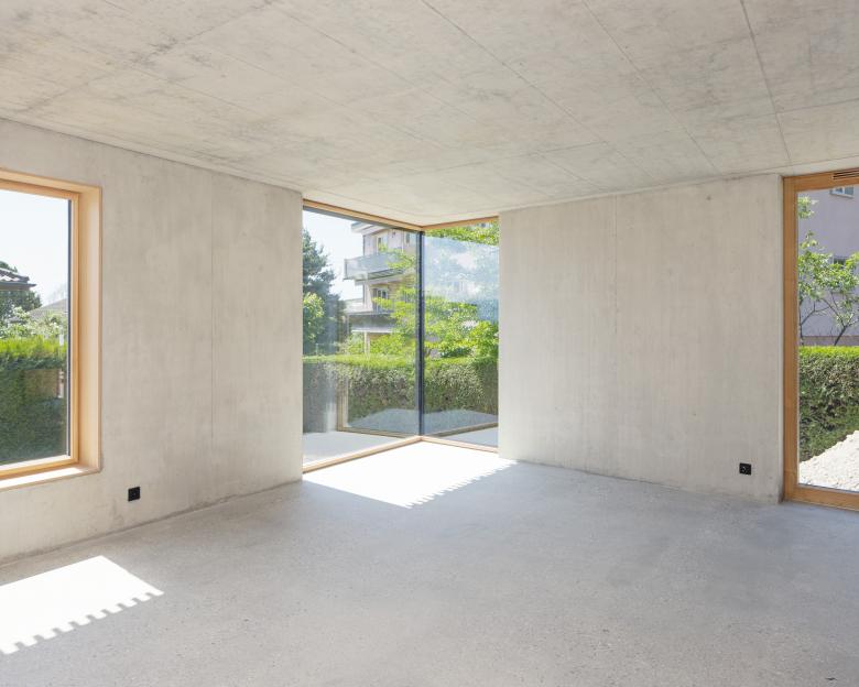 Les matériaux sont laissés bruts est leur nombre réduit au minimum : du béton apparent à l’intérieur, du bois à l’extérieur pour l’essentiel. L’ambiance et la richesse aussi bien intérieures qu’extérieures sont obtenues par l’assemblage, la mise en œuvre et le traitement de ces matériaux : un béton calepiné pour les murs, des dalles poncées révélant des agrégats, un clairevoie soigneusement dessiné en façade qui revisite le bardage vertical traditionnel. Ces choix simples et radicaux obéissent aussi à une cohérence énergétique et constructive : les dalles actives transmettent de manière optimale la chaleur, le dessin de la clairevoie a permis au charpentier de préfabriquer entièrement la façade en atelier et optimiser la pose sur le chantier.