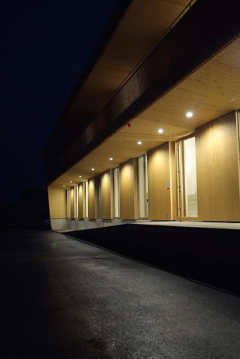 L’enveloppe est réalisée en panneaux agglomérés isolants en façade et en toiture, et les façades nord et sud sont recouvertes d’un lambris à claire-voie. D’autres aspects liés au développement durable caractérisent la réalisation: performance Minergie pour la partie chauffée, panneaux solaires, récupération d’eau de pluie.