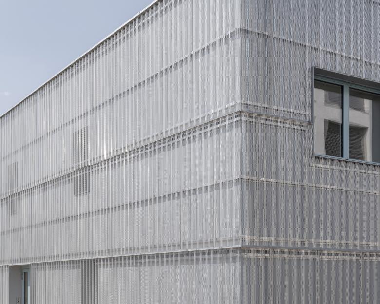 L’ensemble est revêtu d’une « peau » reliant les deux parties d’ouvrage dans un langage architectural commun donnant à lire un bâtiment unique et compact. L’expression architecturale sobre et rationnelle du bâtiment renvoie tant au caractère industriel du site qu’à l’affectation même d’une caserne de pompiers. La tôle perforée et les grandes ouvertures expriment l’usage du bâtiment