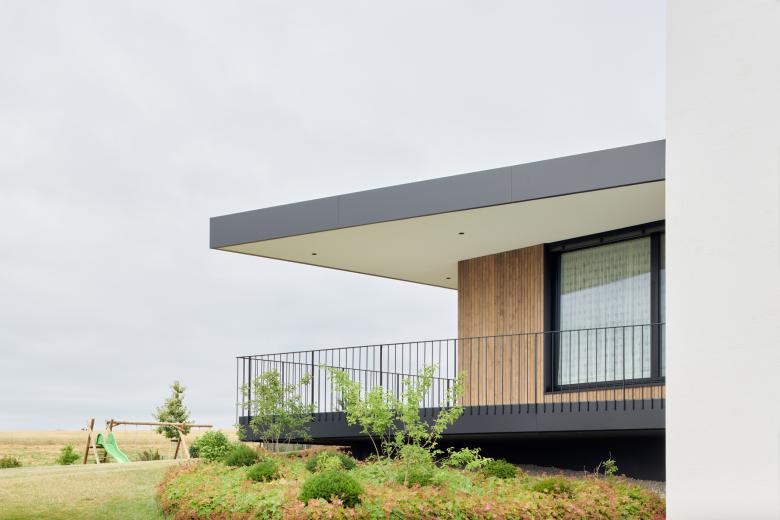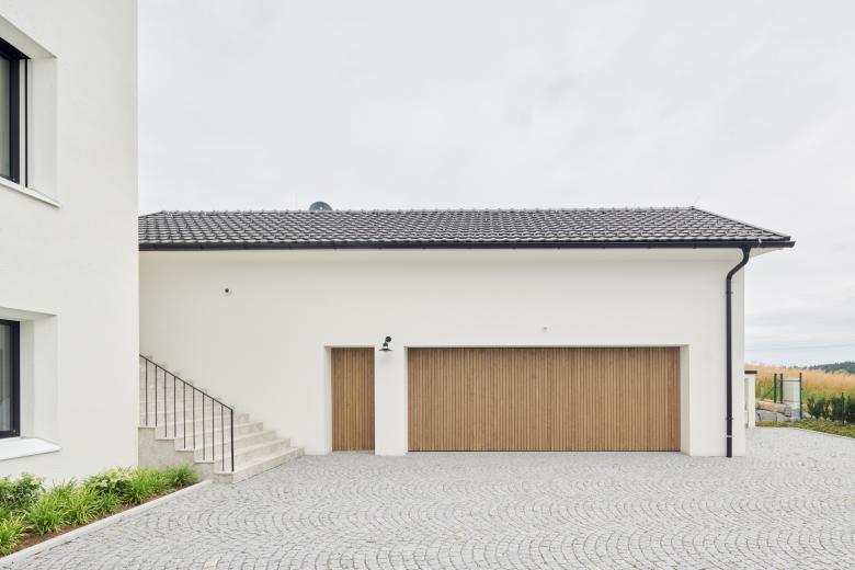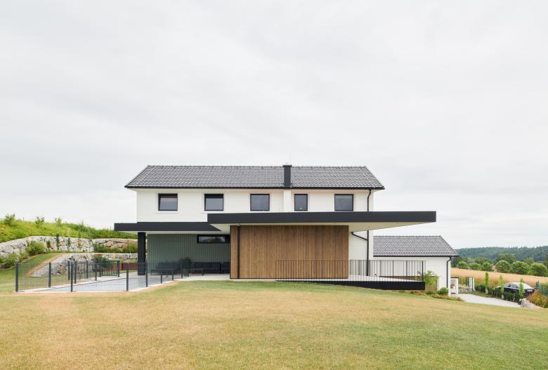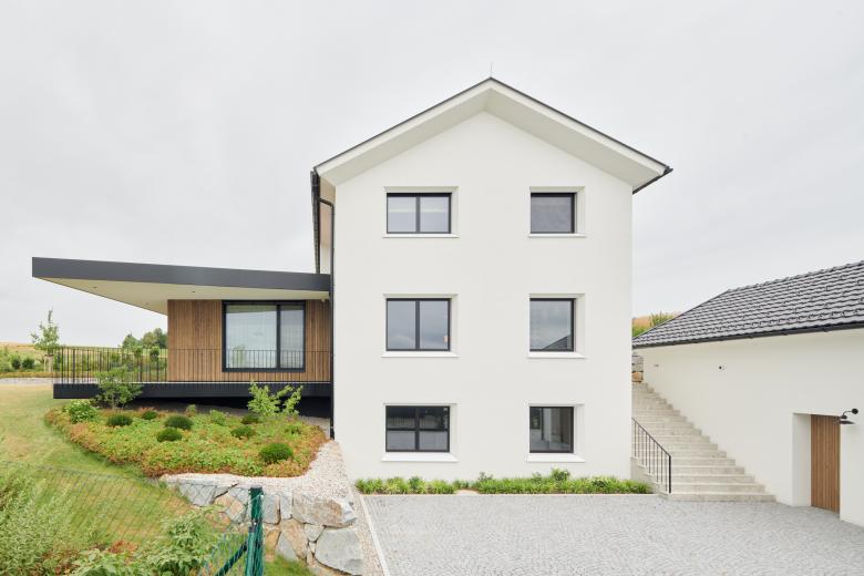 Moderne Linien treffen auf ein typisches Satteldach mit Gesims, wodurch das Haus einem Widum anmutet und so den ländlich moderneren Charakter prägt.