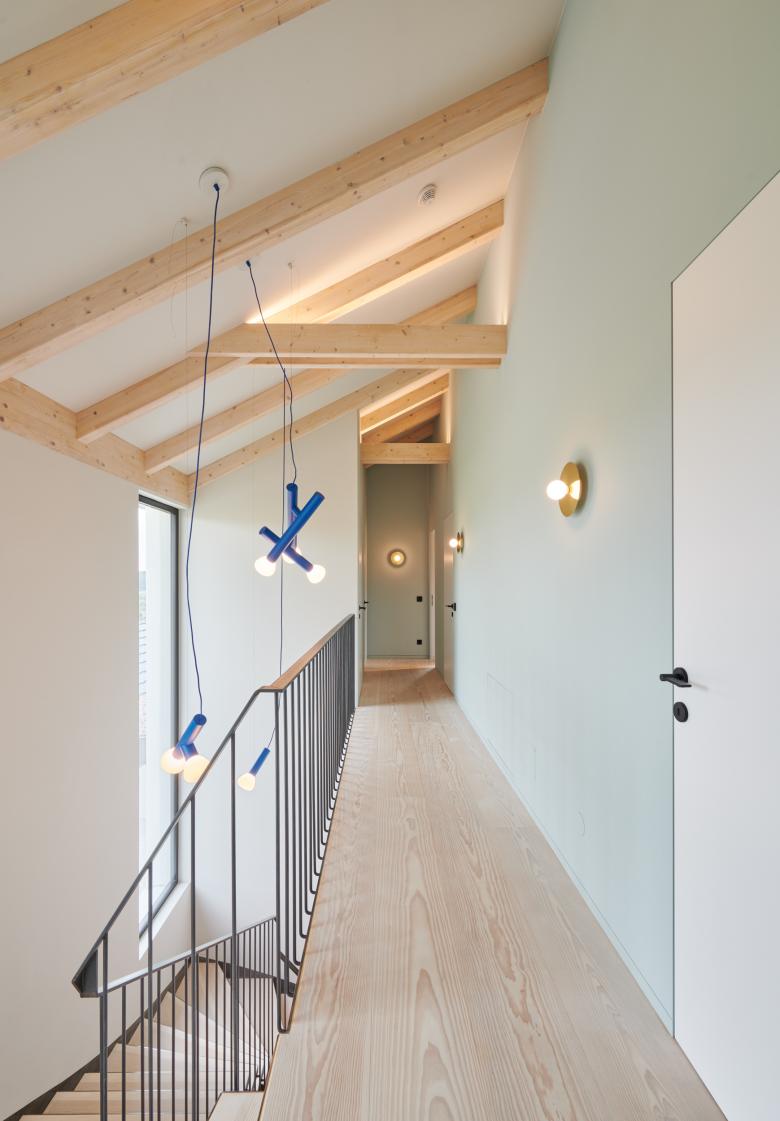 Der offene Wohn-, Koch- und Essbereich im Erdgeschoss ist großzügig geschnitten und bietet viel Raum für gemeinsame Stunden. Die Individualräume wurden separiert im Obergeschoss mit eigenen Bädern und Ankleidezimmer realisiert.