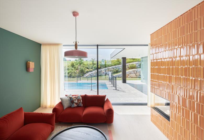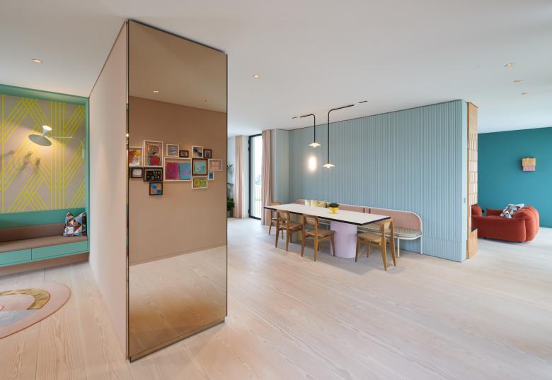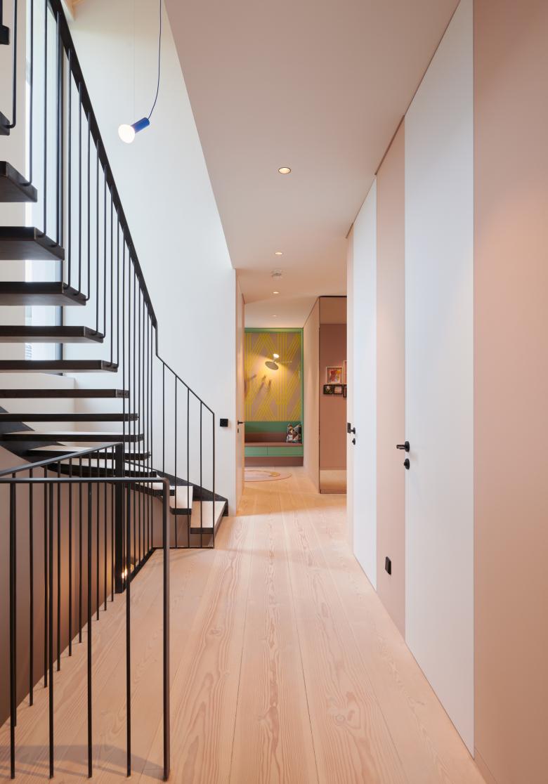 Der Innenraum wurde von Stephanie Thatenhorst gestaltet und besticht mit kräftigen, großflächigen Farben. Das Design kreiert einen spannenden Kontrast zum äußeren Erscheinungsbild des Hauses.