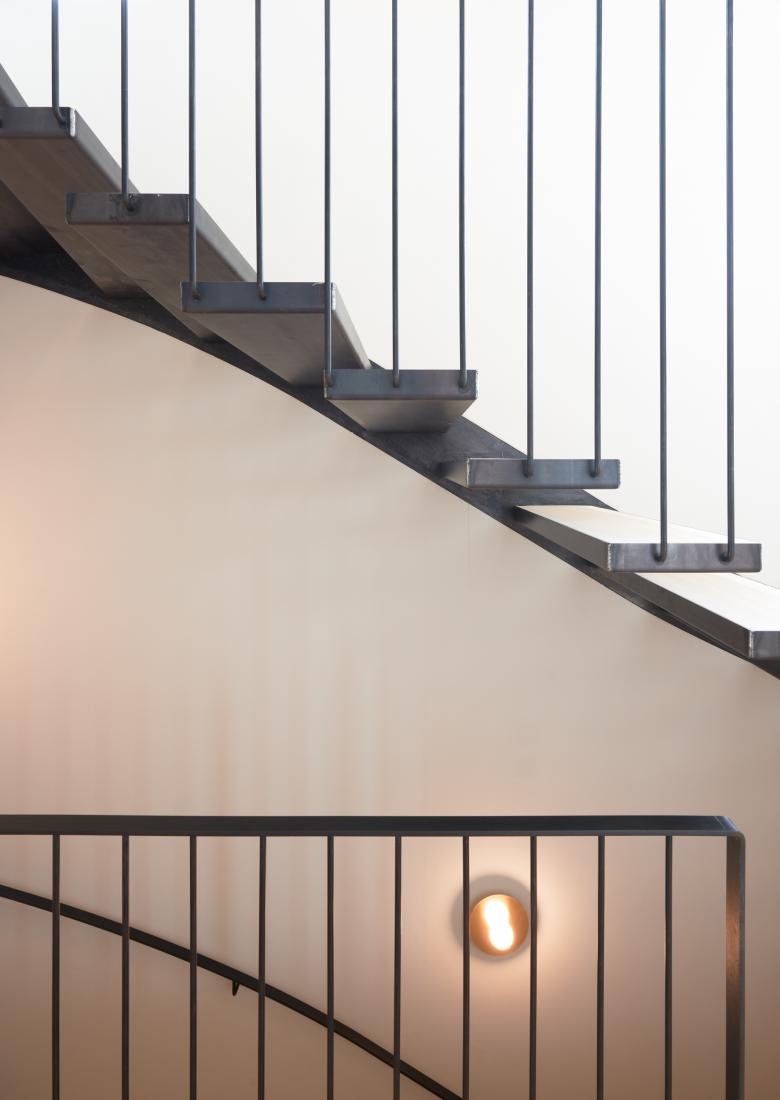 Ein Hauptaugenmerk bei dem Entwurf war auch die vertikale Erschließung. Die freitragende Innentreppe verbindet nicht nur die Etagen miteinander, sondern wird auch zur Skulptur. Die Schlosserkonstruktion aus Rohstahl mit Holzstufen repräsentiert die Handwerkskunst und wird zu einem Hauptgestaltungselement des Innenraumes.