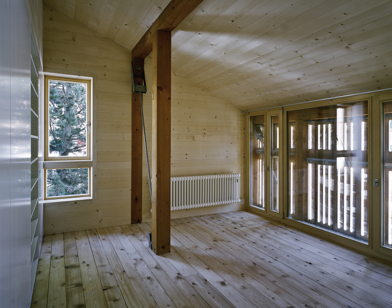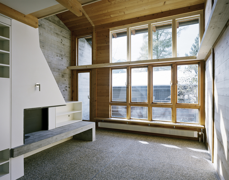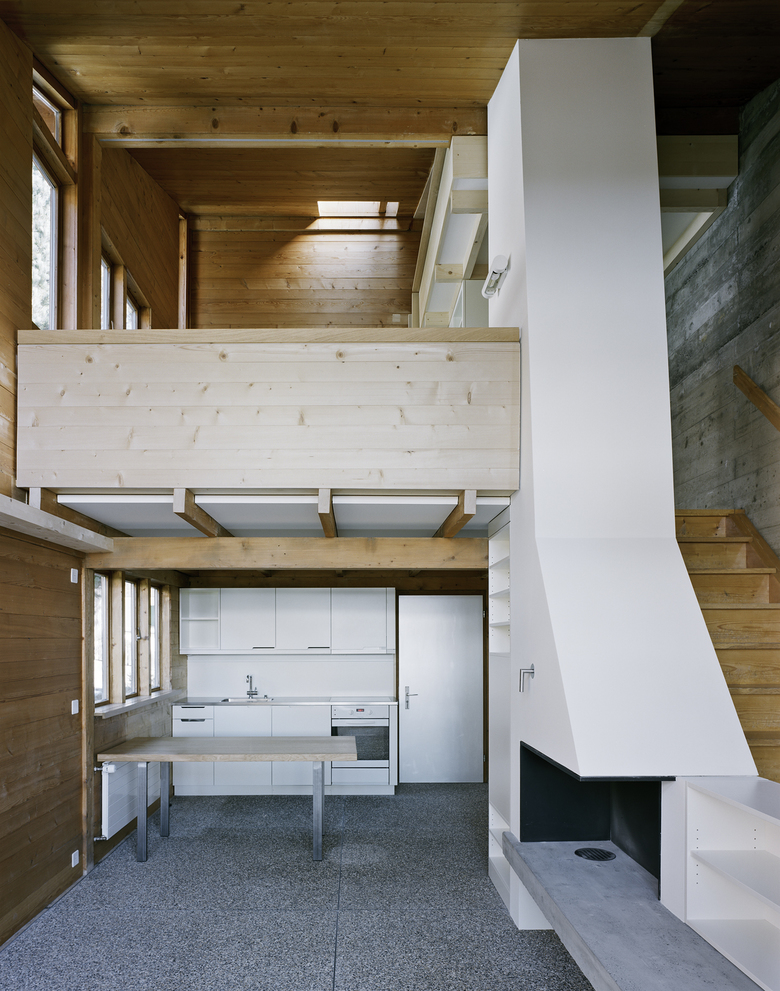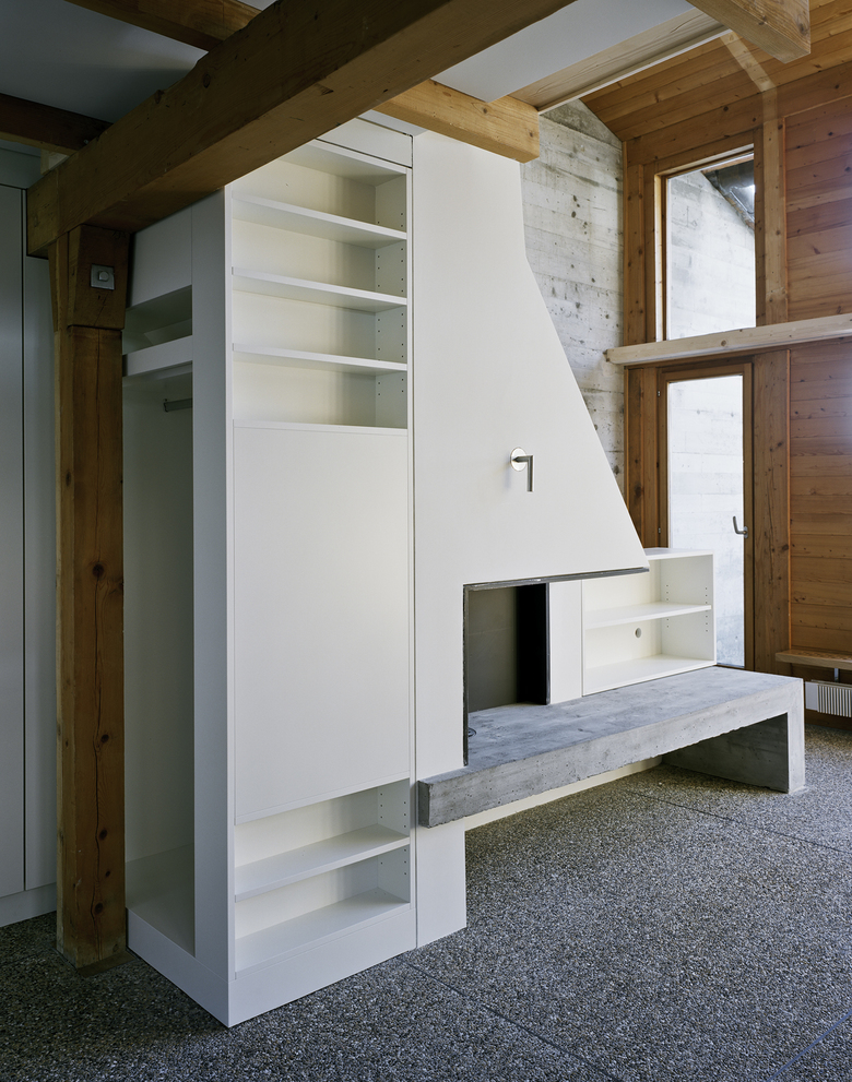 Das 1972 entstandene Dreifamilienhaus an der Hubelstrasse in Adelboden ist eines der wenigen Holzhäuser des Atelier 5. Der Grundriss des Hauses wird über zwei T-förmig angeordnete Betonscheiben in 3 unterschiedlich grosse Maisonette-Wohnungen unterteilt. Die zwei grösseren Wohnungen verfügen beide über einen zwei bis dreigeschossigen Luftraum im Wohnbereich, während die kleinere Wohnung ohne dieses charakteristische Merkmal auskommen musste. Im Zuge anstehender Renovations- und Sanierungsarbeiten konnte nun mit dem Einbezug des kaum benutzten Spiel- und Abstellraums über dem Autounterstand auch für diese Wohnung die räumlichen Qualität und Grosszügigkeit der anderen erreicht werden.
