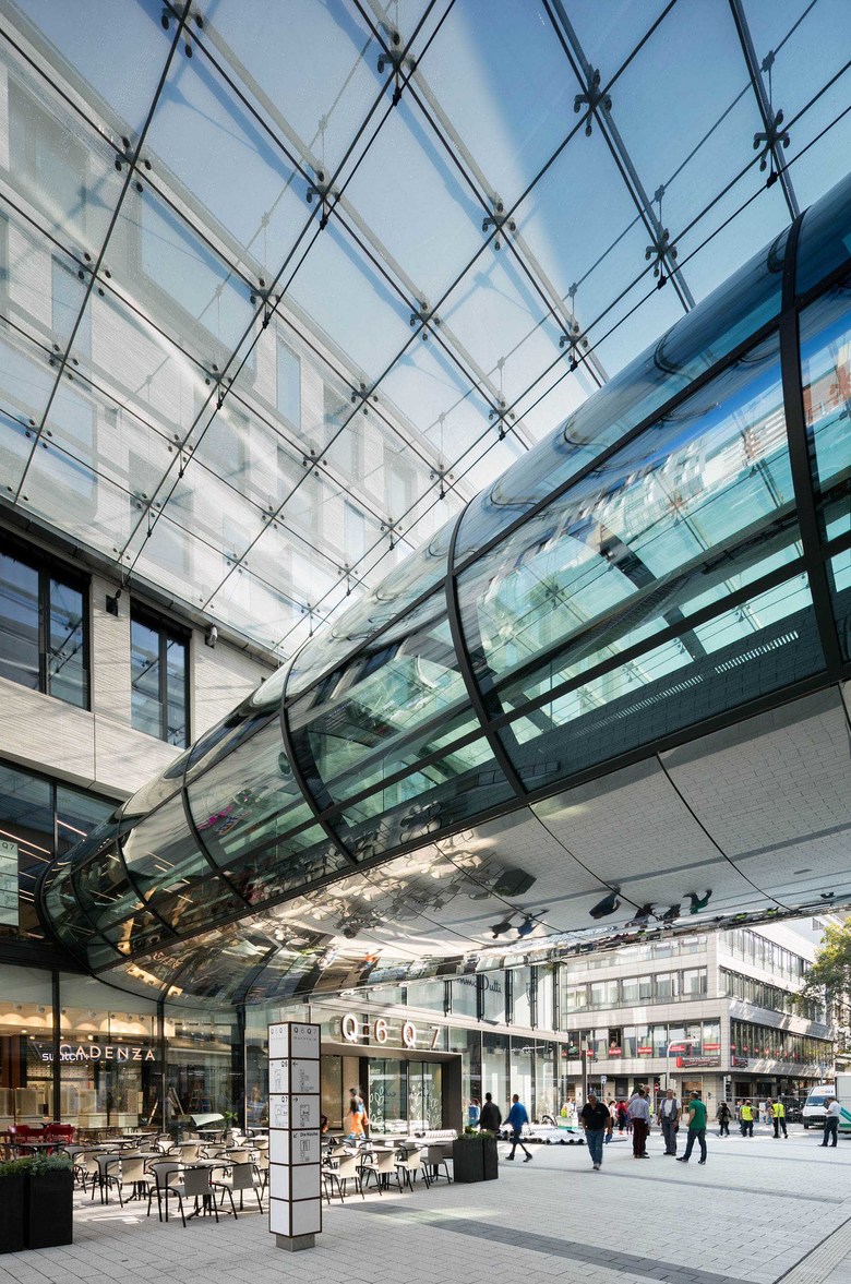 Das Architekturbüro blocher partners entwirft mit dem multifunktionalen Stadtquartier Q 6 Q 7 eine vertikale Stadt aus Gastronomie, Gewerbe, Freizeitangebote, Wohnen und einem Hotel. Im Herzen von Mannheim ist so ein lebendiges, urbanes Quartier mit vielseitiger Nutzung und hoher Aufenthaltsqualität entstanden. Die Architektur integriert das Neubau-Ensemble sensibel in das städtebauliche Umfeld. Verschiedene Zugänge sorgen für eine konsequente Vernetzung innerstädtischer Wege. Harmonisch und zugleich selbstbewusst fügt sich Q 6 Q 7 mit diesem offenen Konzept ins traditionelle Stadtbild. Von Anfang an ging es den Architekten und Stadtplanern um mehr als eine Mall im Zentrum von Mannheim, ihnen schwebte ein urbaner Kristallisationskern vor, der auch nach Ladenschluss belebt ist. Dazu nutzte das Architekturbüro die besondere Topographie Mannheims, dessen Quadratraster an der Grenze der ehemaligen Stadtmauer von einem Kreisbogen geschnitten wird. Unter einem großen Glasdach und einer transparenten Verbindungsbrücke spannt sich ein neuer Stadtraum auf. Er verbindet zwei korrespondierende Häuser und damit auch die Quadrate Q 6 und Q 7, die ihrerseits das Wegenetz zwischen Kunststraße und Fressgasse erweitern und stärken.