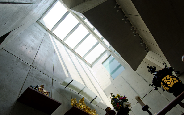 最後に仏、法、僧の三宝になぞらえた3つのトップライトで空間を縦に穿つことで、拝殿する本尊上部から光が降りそそぎ、明るく親しみやすい雰囲気を漂わせている。