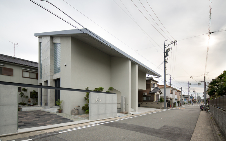 次いで1階には西の方角を拝殿するように本尊を配置し、2階には多目的に使用することが出来る壇信徒会館を設けて積層させる。そこに5mの張り出しをもつ片流れの薄い大屋根が覆うことで寺院建築としてのシンボル性を獲得する。