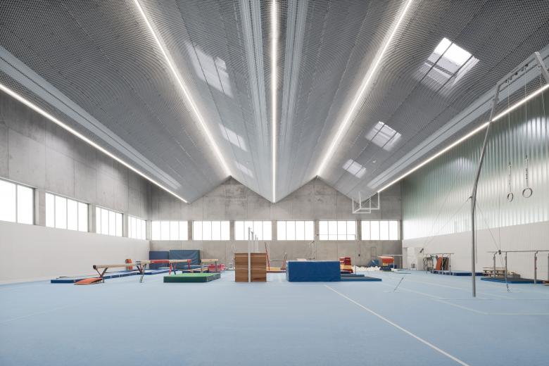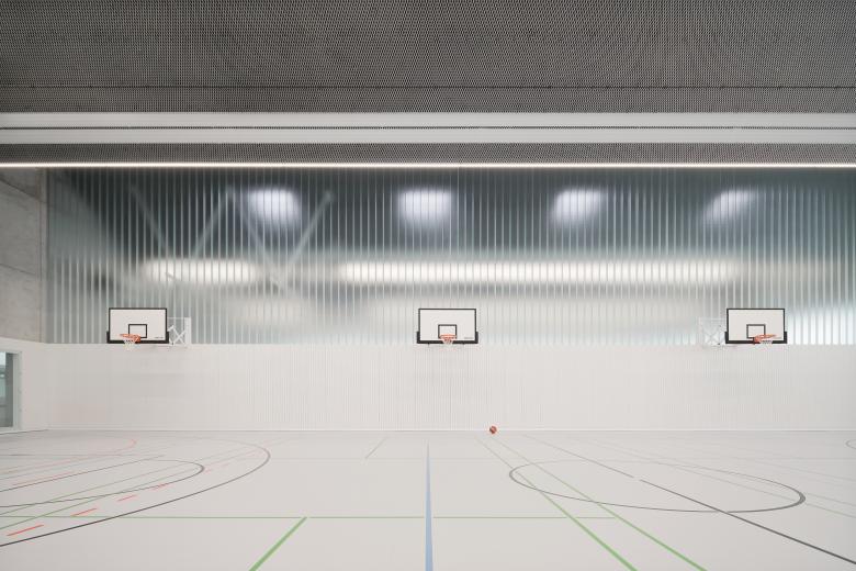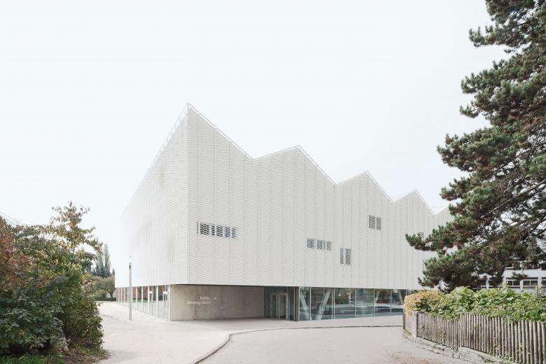 Mit der Fassade aus weißem Streckmetall präsentiert sich das Sportzentrum als eleganter Solitär. Das markant gefaltete Hallendach strukturiert den Baukörper und vermittelt zu den benachbarten, kleinmaßstäblicheren Wohnbauten. Somit fügt es sich in die Dachlandschaft ein und erhält zugleich einen hohen Identifikationswert. Im Inneren sind Sichtbeton und weißes Streckmetall prägende Materialien. Großzügige Verglasungen versorgen das Gebäudeinnere mit Tageslicht und tragen zur hohen Aufenthaltsqualität bei.