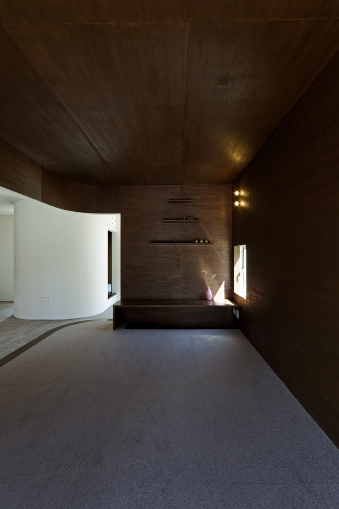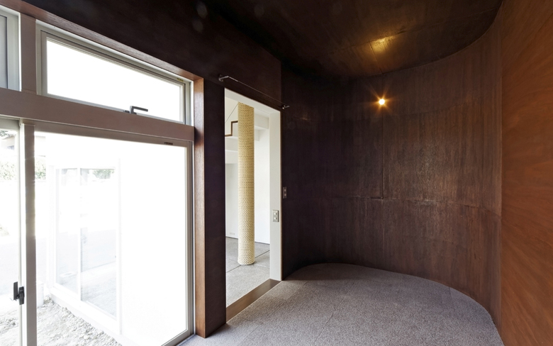 外皮となる外壁部分には木片のイメージをもつ材料を、敷地によって切りとられている面は材質を変える。また、内部は樹木の年輪のイメージから曲線的な平面形状とし、流動的な空間には白いしつらえ、滞留する空間には黒いしつらえを施している。