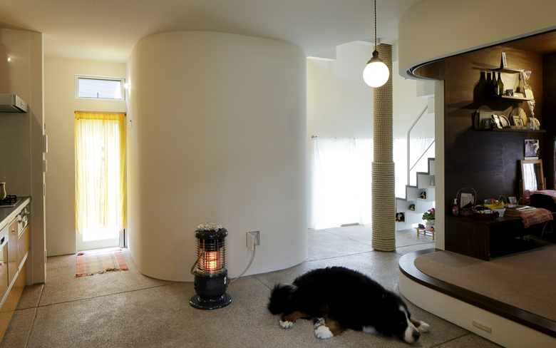 クライアントの要望は、夫婦2人と大きなワンちゃん、ネコちゃんが、とにかく楽しく暮らすための仕掛けであった。次いで、四角い住宅とは異なる、新しいイメージの空間が求められた。