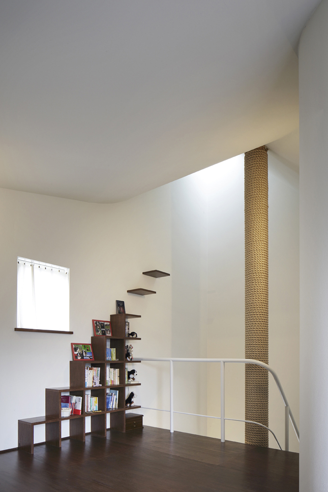 さらに、1階のキッチン、ダイニング、階段のある空間を土間仕上げとし、外部とつなげることで、大きなワンちゃんがグルグル回れる仕掛けとした。ネコちゃんにはトップライトの光が降りそそぐ吹抜け空間にツメ研ぎの縄を施した大黒柱やキャットウォークなど、遊べる仕掛けとした。