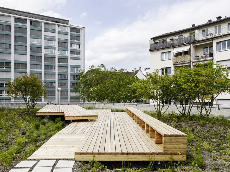 Auf dem Dach des Gebäudes wird ein Dachgarten geschaffen, der den Bewohnern der Wohnsiedlung als Spiel und Ruhefläche dient. Die Fassade aus Rasengittersteinen in Kombination mit der Begrünung des Daches verleiht dem Gebäude von allen Seiten einen eigenständigen architektonischen Charakter, der die Integration in den Hof und in das Quartier stärkt.
