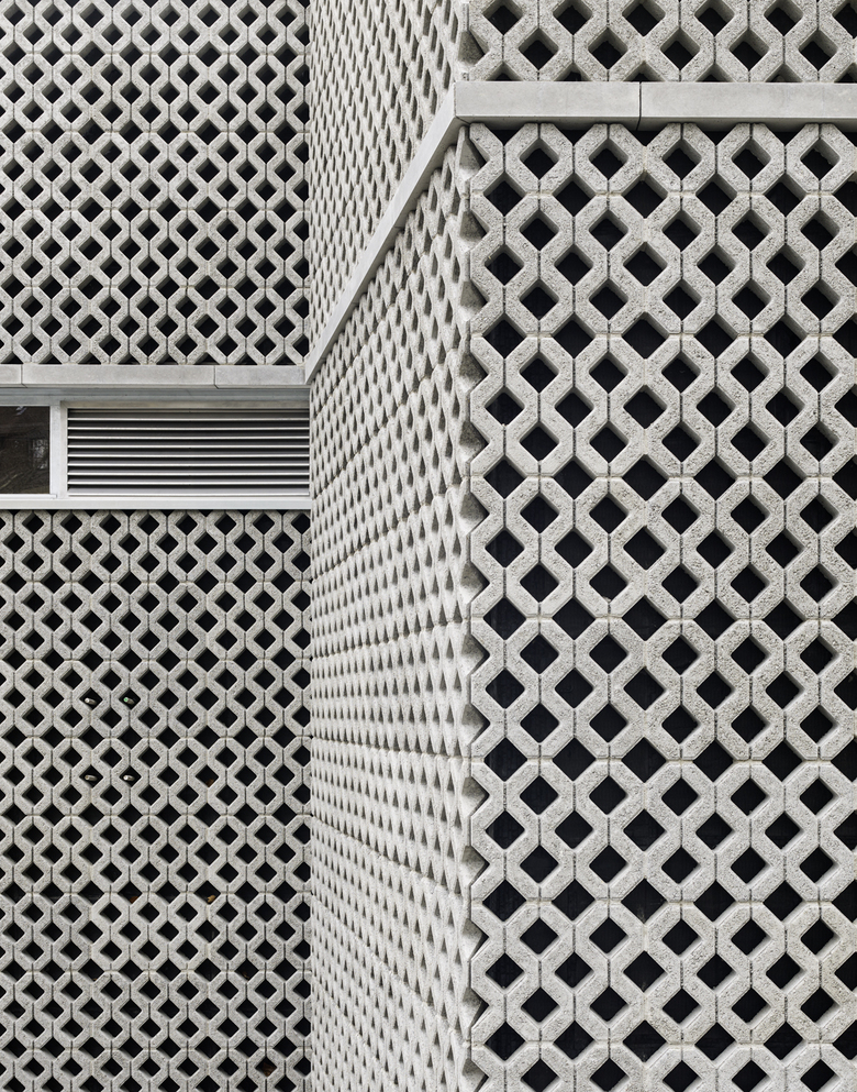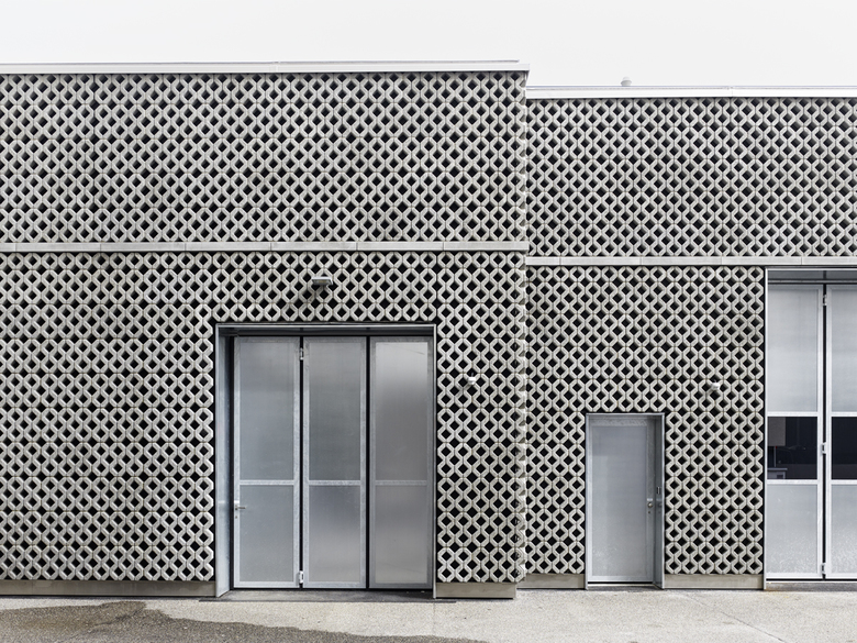 Im Zuge dieser Sanierung wurde die bisher offene Halle baulich abgeschlossen und auf der Südseite mit raum-hohen Schiebefalttoren versehen. Durch die Einhausung wird die Wahrnehmung des Werkhofs stark verändert: Aus dem Unterstand wird ein mächtiges Gebäude, das den Hof dominiert und auch von der Strasse her sichtbar ist. Für die Verkleidung der Fassade werden Rasengitter-steine verwendet, ein günstiges Standardprodukt aus dem Tiefbaubereich, das in jedem Baumarkt erhältlich ist. Durch die ungewohnte Verwendung in der Vertikalen werden die Rasengittersteine nobilitiert und stellen auf verschiedenen Ebenen Bezüge zur Werkhofnutzung und der Umgebung her.