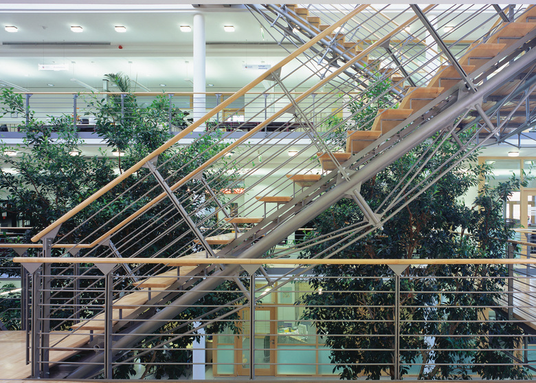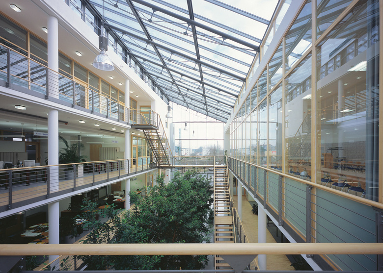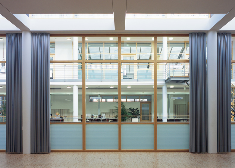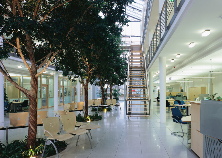 Neben diesem ökologischen Anspruch, lag ein Schwerpunkt der Planung auf der Schaffung einer positiven Arbeitsatmosphäre. Das realisierte Ziel war es, dass sich die Mitarbeiter durch die Architektur noch stärker mit ihrem Unternehmen identifizieren können und diese Kultur nach innen und außen weithin sichtbar wird. Obwohl das Grundstück direkt an der Kreuzung zweier vielbefahrener Straßen sowie in unmittelbarer Nähe einer Hauptbahnverbindung liegt, ist diese Aufgabe umfänglich geglückt. Hierfür wurden die beiden in Putz gehaltenen Gebäudeachsen zu einer begrünten zentralen Halle hin orientiert, die den Bau prägt.