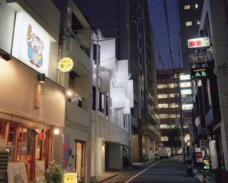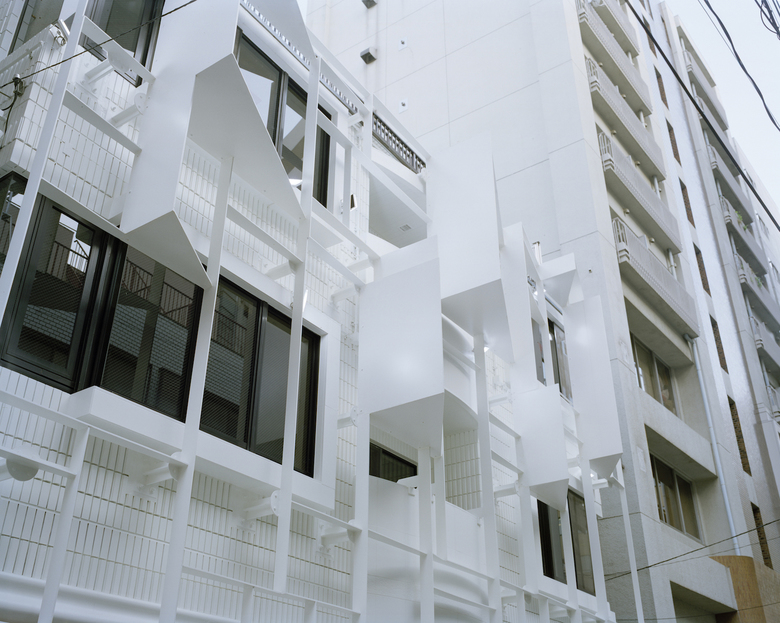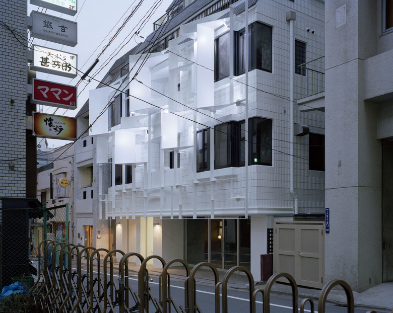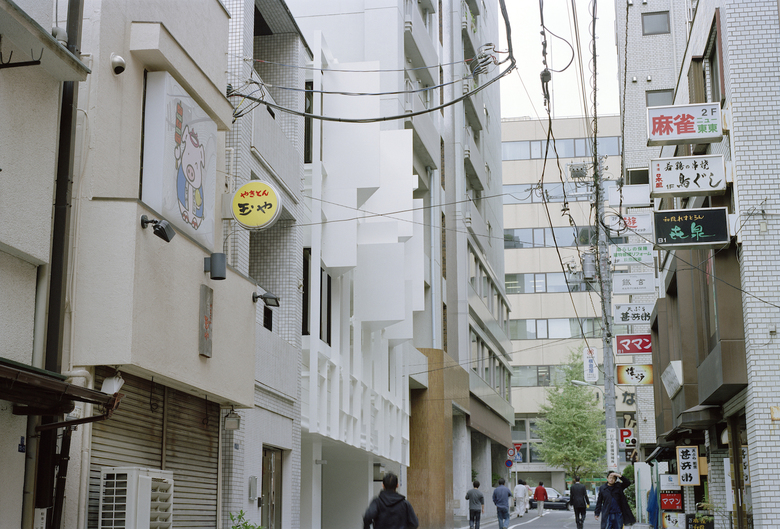 テナントビル改修工事。テナントビルにおいて、ファサードは重要な広告、看板スペースであり、これらに覆い尽くされてしまうことが多い。また「テナント」は常に入れ替わりを前提としたテンポラリーなものであり、店子が変わる度に建物の外壁が全くの別物に姿を変えるようなケースも珍しくない。建物、ひいては街並の印象がテナントの商業的要請によって方向付けられる、というのは決して好ましい状況ではないが、かといって看板を規制するような方法は、経済活動によって支えられているテナントビル、あるいは都市全体にとって自己矛盾的であり、持続力を持ち得ない。そこでここでは「看板」が建物のファサードと一体となるよう計画した。テナントの変化に左右されず、むしろその代謝に呼応し、かたちや様相を変化させる。しかし根本的な質は揺るがない。そんな強度を持った表層を纏うことで、テナントビルのファサードが持つ意味も変わってくるのではないかと期待している。