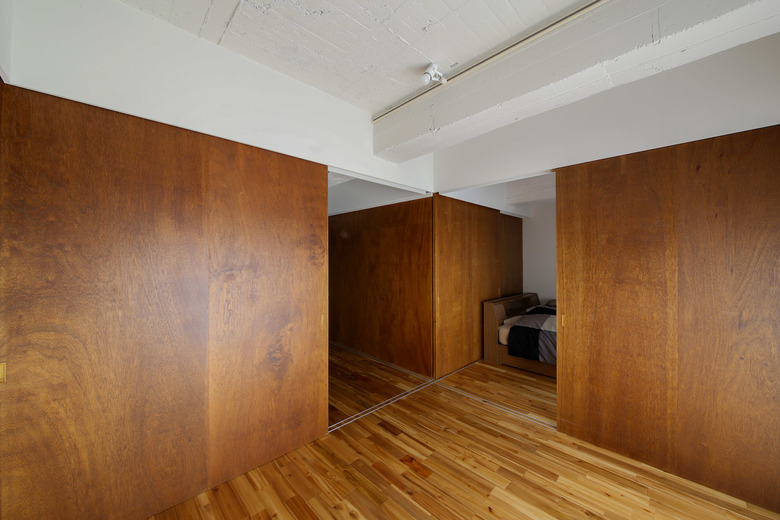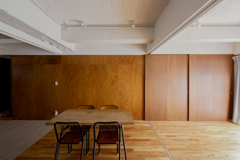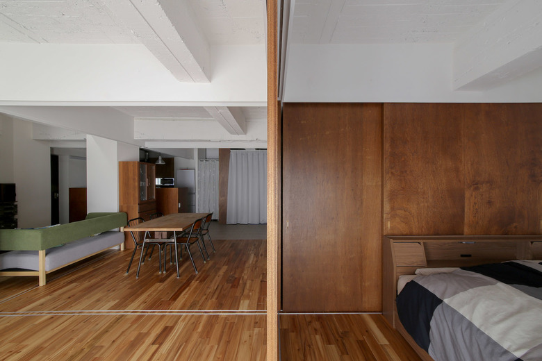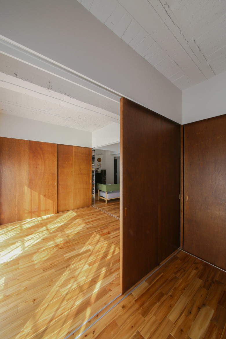 マンションの一室改修。不規則な時間の来客が多い生活スタイルと家族の日常生活を両立させるために、ナインスクエアグリッドの間取りとし、建具の開閉で領域のつながりを調整できるよう計画している。