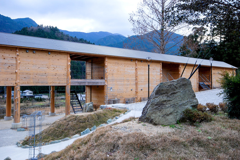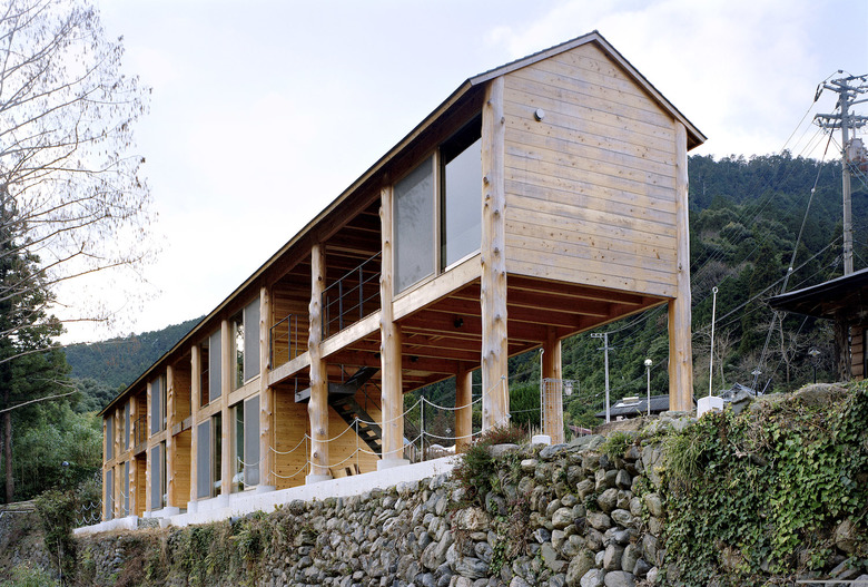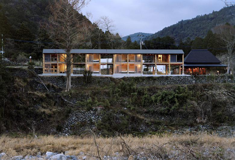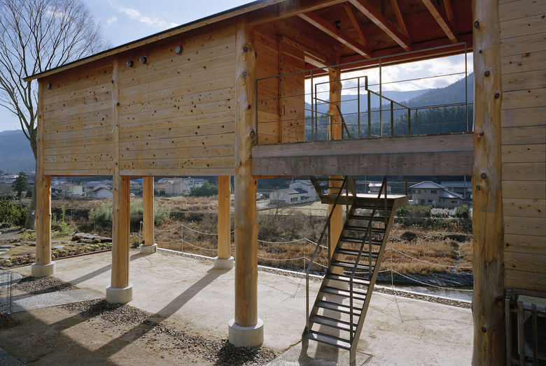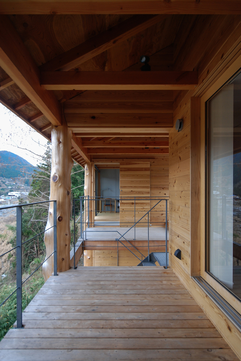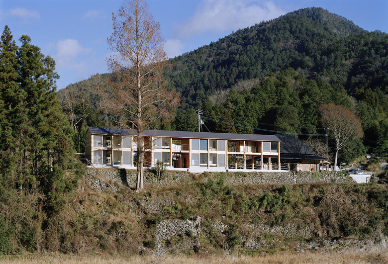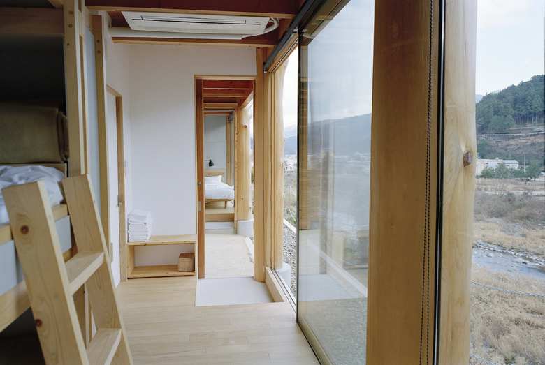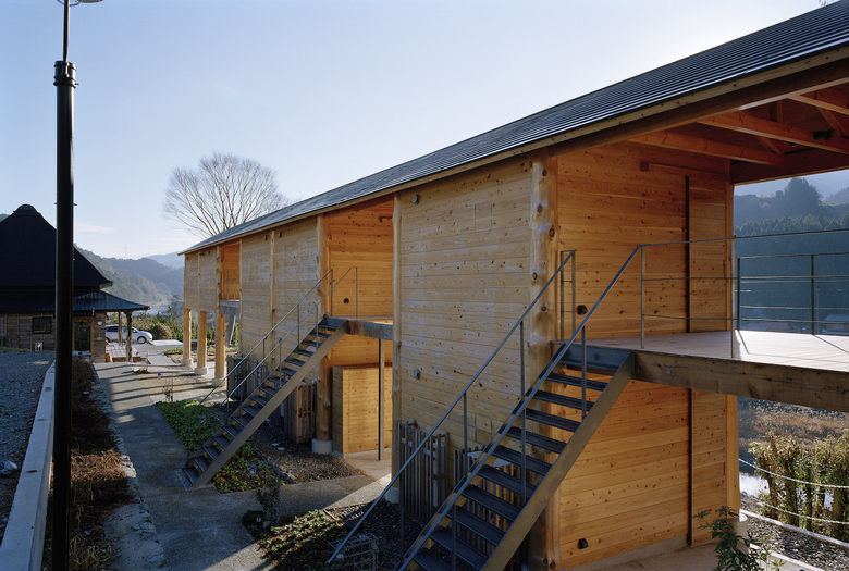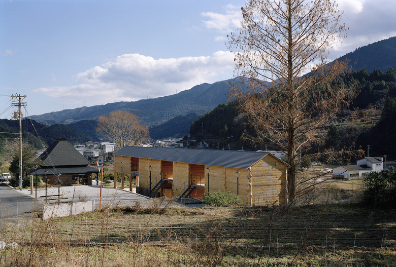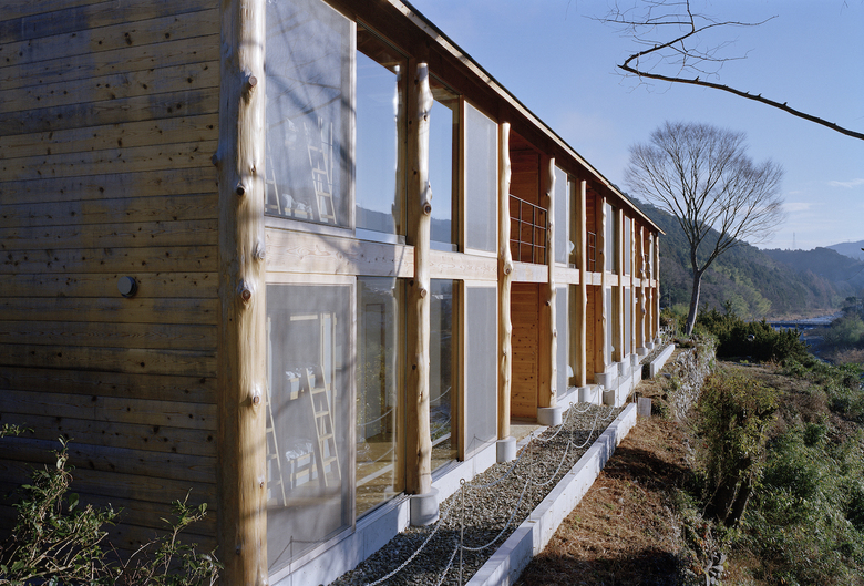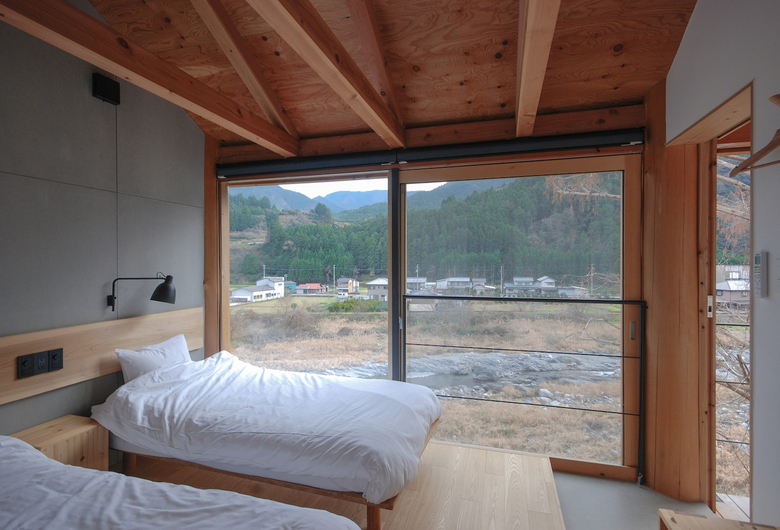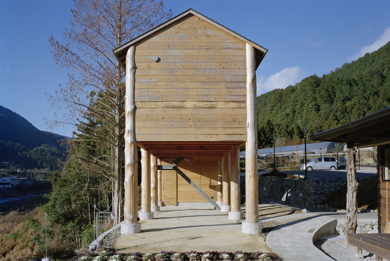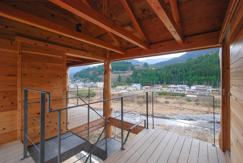 神山町における宿泊施設。山、川、集落、空など、この町の風景を形作る要素を一望できる計画地だったため、その環境の中に放り出されたような客室を持つ宿として計画している。木造建築特有の筋交いや耐震壁によって眺望を妨げないよう、350Φの丸太柱を用いたラーメン構造とし、柱材は町内の山林から伐採した。