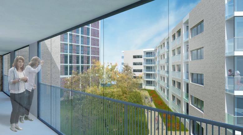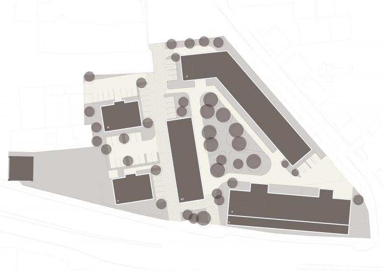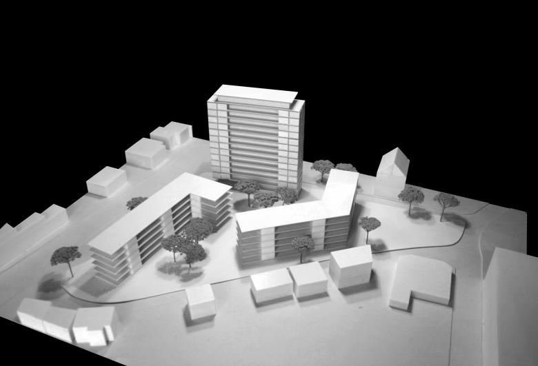 Auf dem Gelände bilden zwei abgewinkelte Riegel einen Block, wobei sich die Baukörper an den öffentlichen Straßen orientieren und einen ruhigen, begrünten Hof umschließen. Durch die Verschränkung der Gebäude öffnet sich die Figur, der Block verliert seine Strenge.