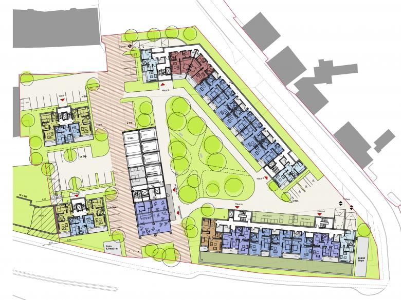 Unter dem nördlichen neuen Wohnblock befindet sich eine Tiefgarage, der südliche Neubau verfügt über eine Tiefgarage sowie 2 Parkgeschosse. in den darüber liegenden Etagen sind Wohnungen angeordnet.
